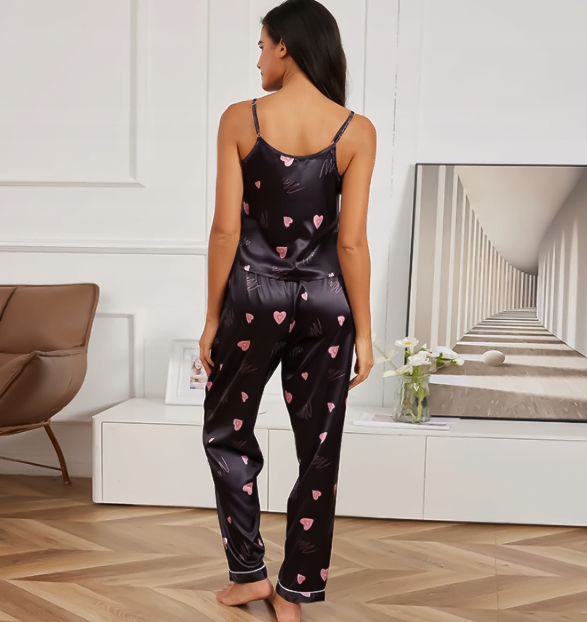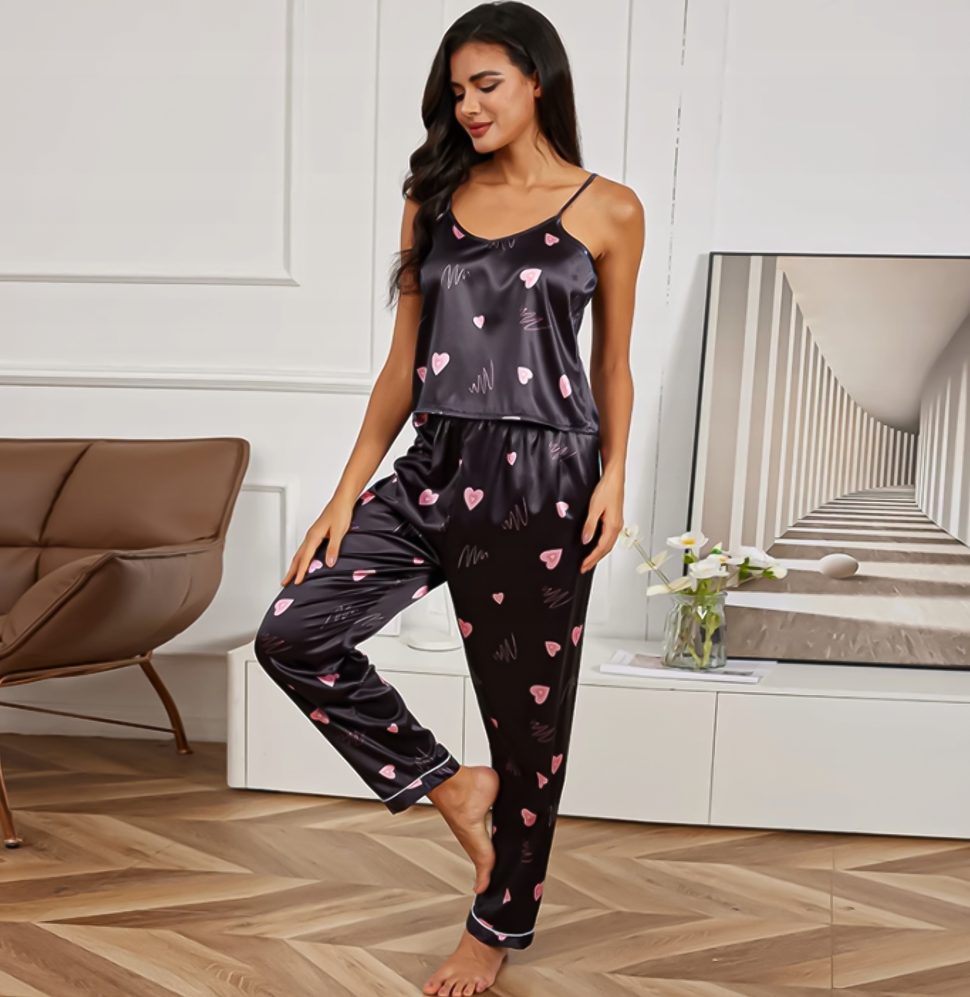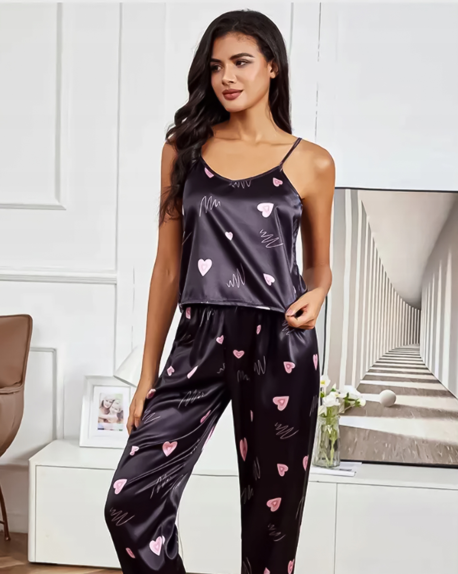 Колір чорний надає піжамі тонкість і романтичний шарм, ідеально поєднуючись з будь-яким відтінком шкіри. Крім того, чарівнісердечка, які прикрашають як топ, так і штани, додають унікального характеру та стилю піжамі.