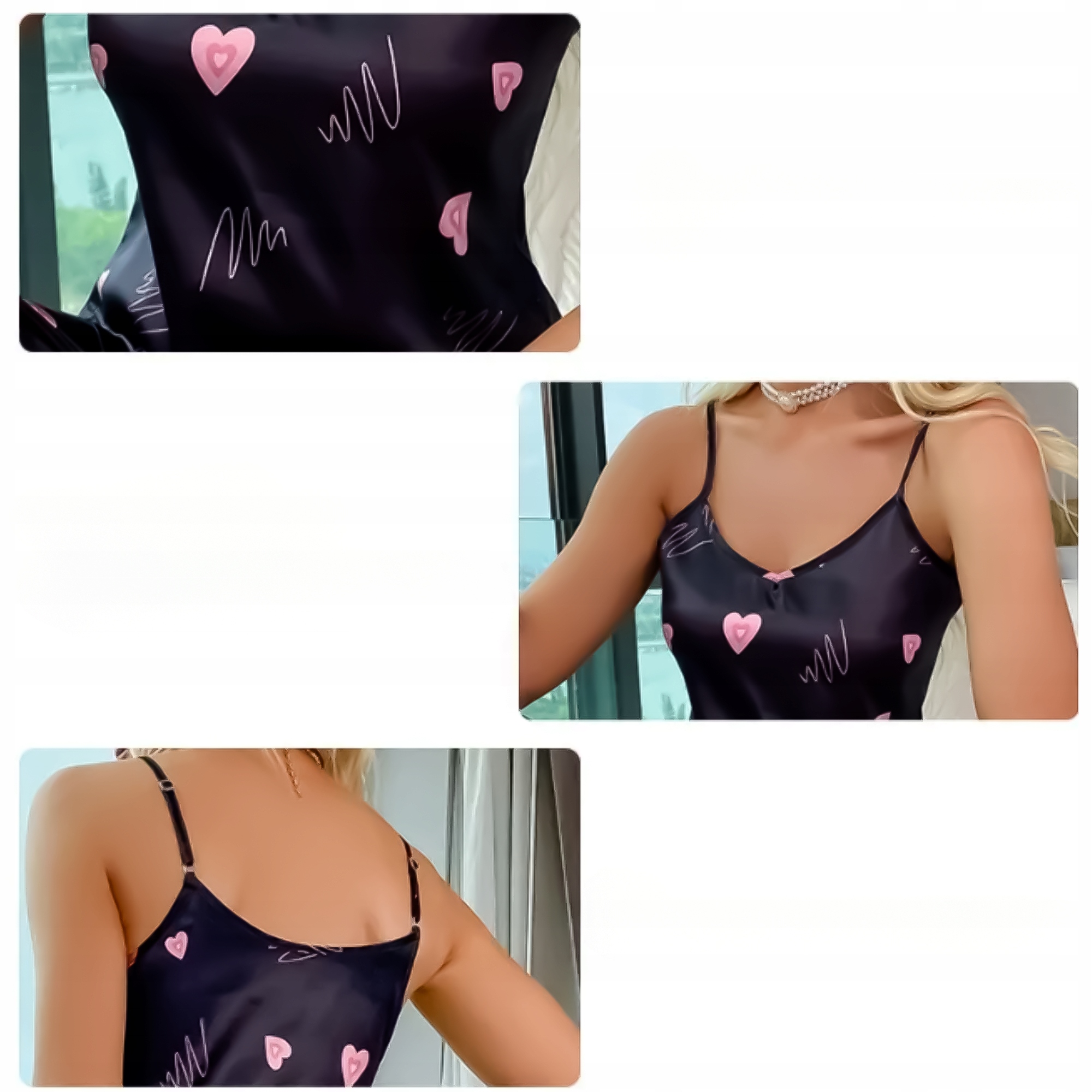 Чорний колір у поєднанні з чарівними сердечками надає піжамі надзвичайний шарм і романтичний вигляд, який підкреслює природна жіночність жінки, яка її носить.