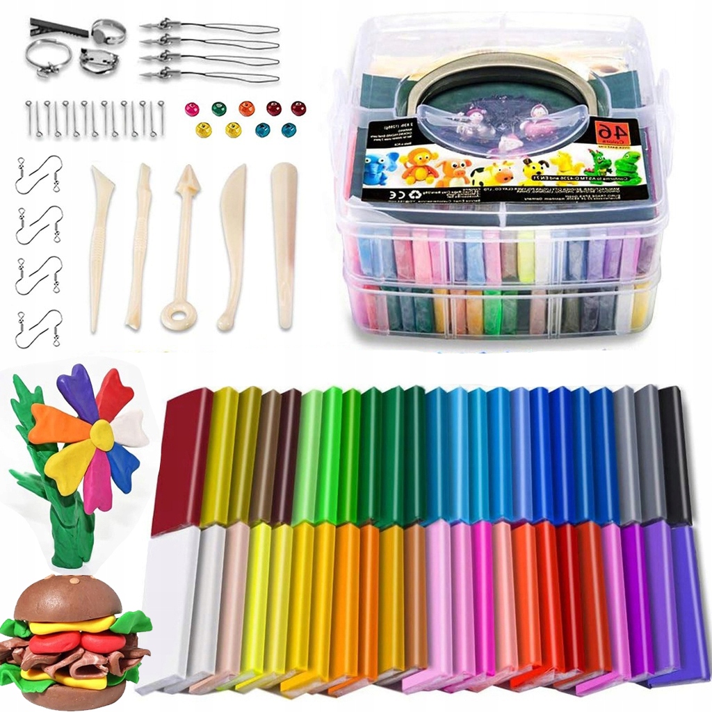 - 46 штук кольорової глини, що спалюється в духовці (28 г/арт), 1 подвійне майно зберігання, 5 інструментів для укладання та 40 ювелірних аксесуарів, зручно, що зберігається в чарівному пластиковій. Легко створити сережки, ключові кільця, шпильки та кільця. Найкращі подарунки ручної роботи.