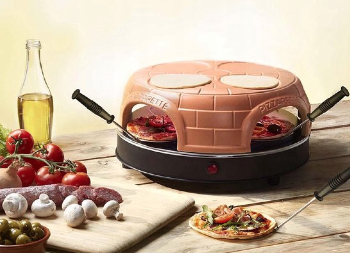 - Підходить для 4 осіб. Функція попереднього смаження, гриль-бруше або підтримання міні-піци теплою на верхній частині купола