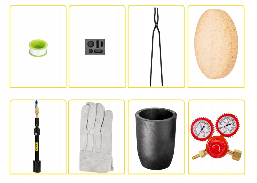Цей комплект для плавлення металу включає пропанову піч, факел, тигель вагою 10 кг, матрицю з графітовим блоком, регульований регулятор пропану (0-350 psi), щипці для тигля, вогнетривку цеглу, захисні рукавички, трахею довжиною 2,5 м і тефлонову стрічку.