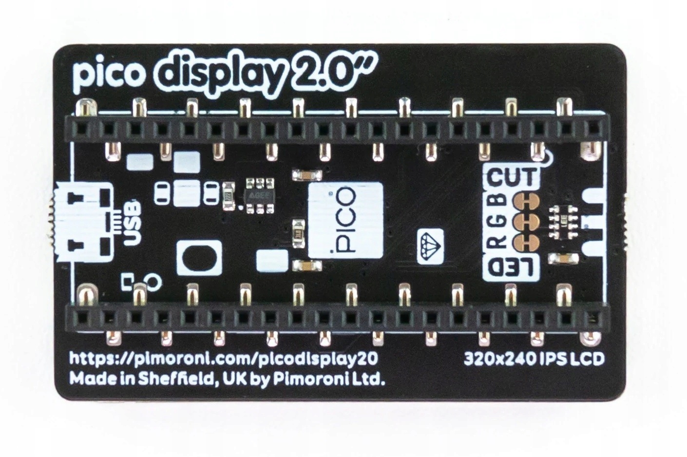 Модуль із 2" IPS кольоровим РК-дисплеєм із роздільною здатністю 320x240 px призначений для роботи з Raspberry Pi Pico. Зв'язок відбувається через інтерфейс SPI. Він може відображати вміст у повному діапазоні 65 тис. кольорів, а в розпорядженні користувача є 4 кнопки та світлодіод RGB. Повна документація з прикладами доступна на веб-сайті продукту.
