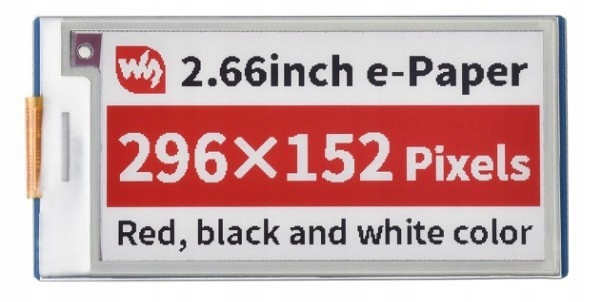 Модуль із 3-кольоровим дисплеєм e-Paper з діагоналлю 2.66" і роздільною здатністю 296x152 px, призначений для роботи з Raspberry Pi Pico. Він має можливість відображати вміст з дворівневою шкалою сірого, а вбудований контролер спілкується через інтерфейс SPI. Дисплеї цього типу характеризуються високою контрастністю виведеного зображення і споживають електроенергію тільки при зміні відображуваного контенту. Модуль сумісний з системами 3,3 В. Повна документація доступна на Wiki-сторінці продукту.