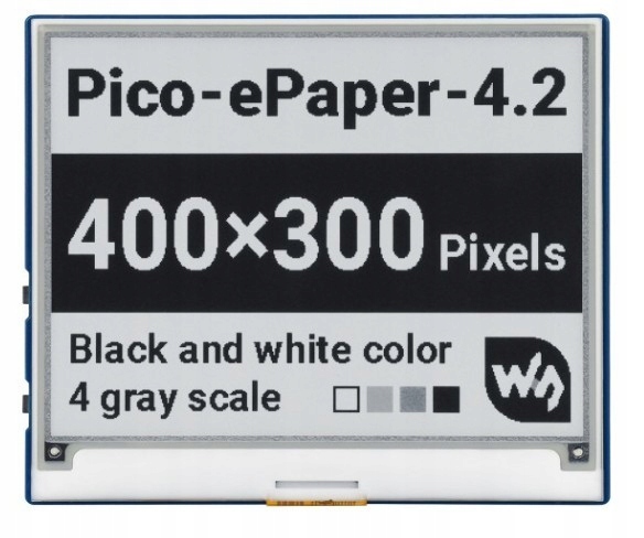 Модуль із чорно-білим дисплеєм електронного паперу з діагоналлю 4.2" і роздільною здатністю 400x300 px, призначений для роботи з Raspberry Pi Pico. Він може відображати вміст із чотирирівневим відтінком сірого, а вбудований контролер спілкується через інтерфейс SPI. Дисплеї цього типу характеризуються високою контрастністю виведеного зображення і споживають електроенергію тільки при зміні відображуваного контенту. Модуль оснащений перетворювачем рівня напруги і сумісний з системами 3,3 В і 5 В. Повна документація з прикладами використання доступна на Wiki-сторінці продукту.