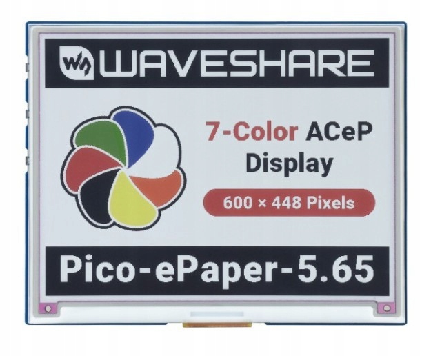 Модуль ACeP електронного паперу із 7- кольоровий дисплей з діагоналлю 5,65" і роздільною здатністю 600x448 px, призначений для роботи з Raspberry Pi Pico. Він має можливість відображати вміст у дворівневих відтінках сірого та підтримує технологію ACeP (Advanced Color ePaper). Вбудований контролер спілкується через інтерфейс SPI. Дисплеї цього типу характеризуються високою контрастністю виведеного зображення і споживають електроенергію тільки при зміні відображуваного контенту. Модуль сумісний з системами 3,3 В і 5 В. Повна документація з прикладами доступна на Wiki-сторінці продукту.