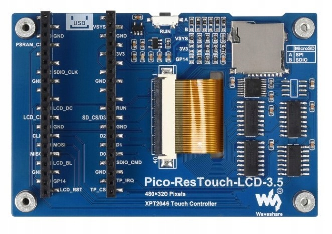Модуль із кольоровим IPS РК-дисплеєм із Діагональ 3,5" і роздільна здатність 480x320 пікселів, призначені для роботи з Raspberry Pi Pico. Він оснащений резистивним сенсорним екраном і вбудованим контролером ILI9488 і контролером XPT2046, які обмінюються даними через інтерфейс SPI. Він може відображати вміст у повній кольоровій гамі 65K, а на платі є слот для карт пам’яті microSD. Модуль сумісний із системами 5 В. Повна документація з прикладами доступна на Wiki-сторінці продукту.