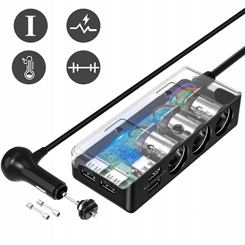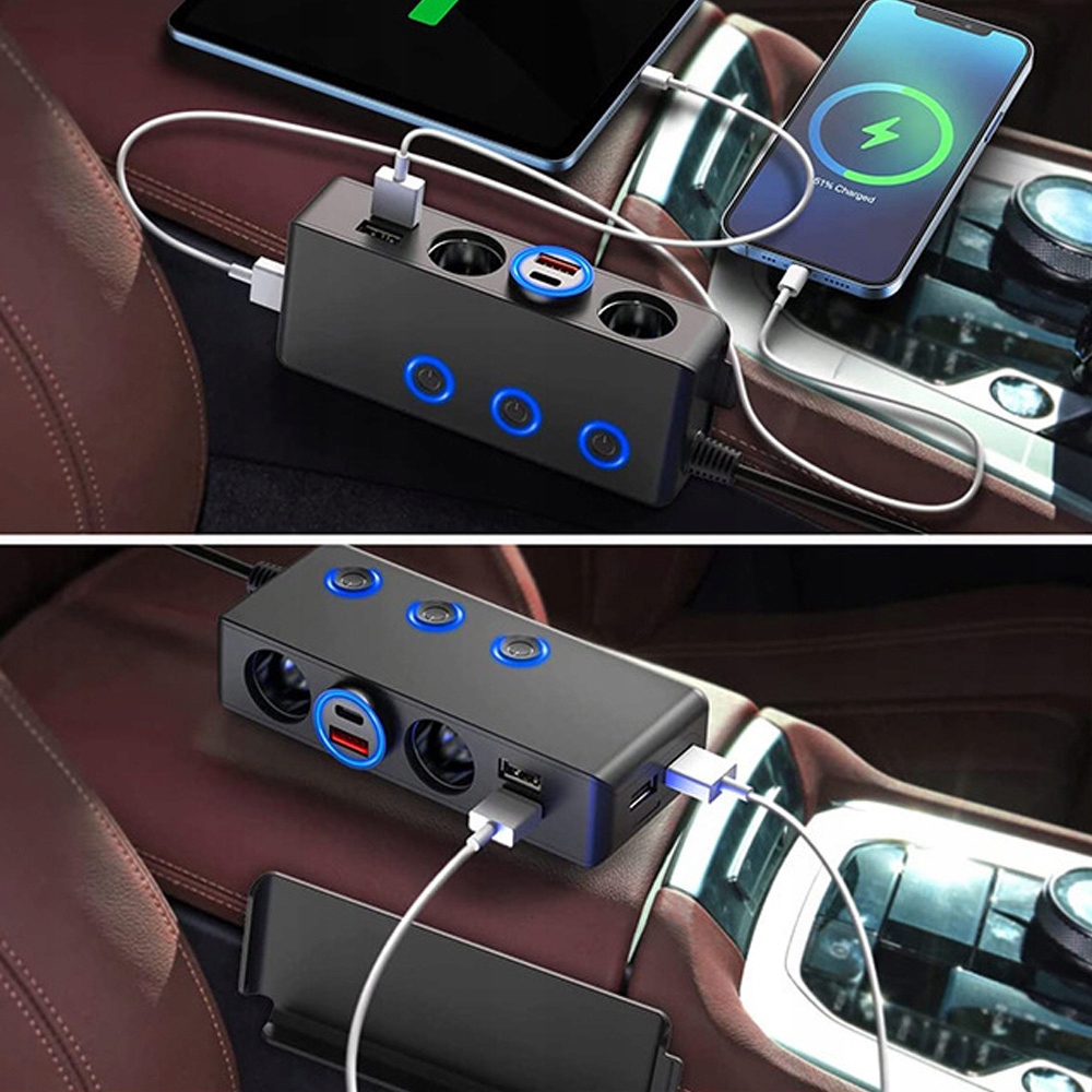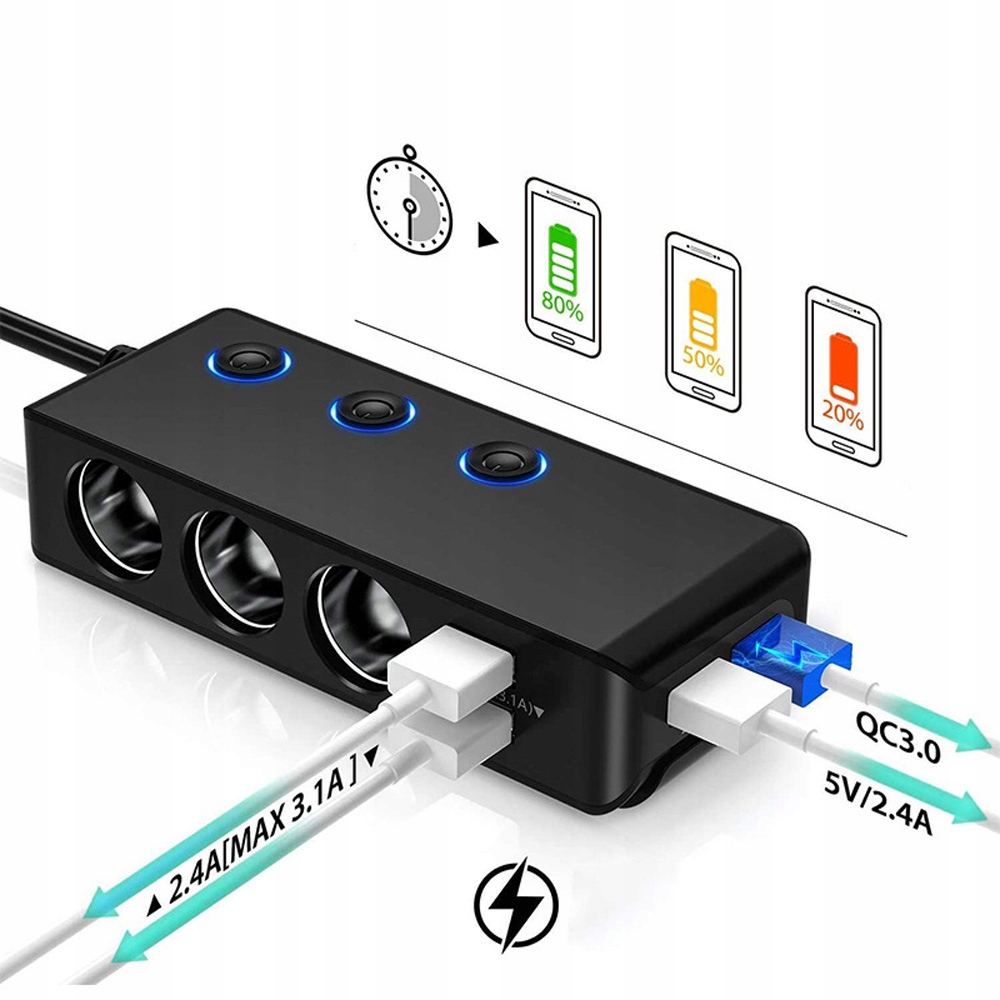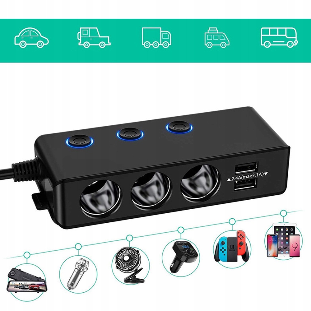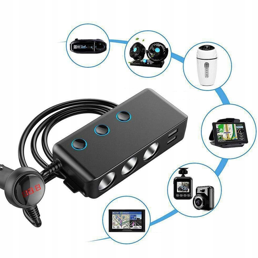 🚗🚗- розширює 1 розетку легших до 3-х сигаретних сокетів (з незалежними комутаторами) та 4 портами USB. Він підтримує максимум 60 Вт для запальнички та загалом 120 Вт, що ідеально підходить для підключення автомобільних аксесуарів, таких як GPS-пристрої, автомобільні камери, шанувальники, заряджання кабелів та інших.