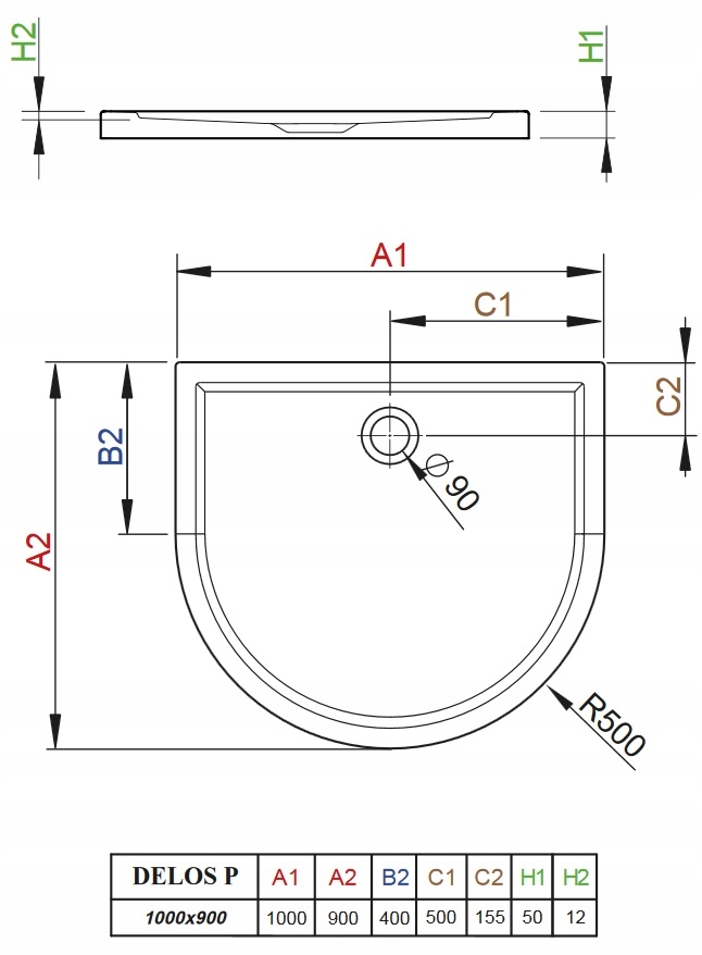 Предмет продажу душовий піддон напівкруглий Delos P 100х90х5х1,2 (глибина). Дуже неглибокий настінний акриловий душовий піддон, призначений для установки безпосередньо на підлогу з отвором для сифона діаметром 90 мм. Для душових піддонів цієї серії підходять сифони: TB90, TB21, TB XS, R500, R580, R510, R400 SLIM або R400W SLIM (є на інших наших аукціонах).