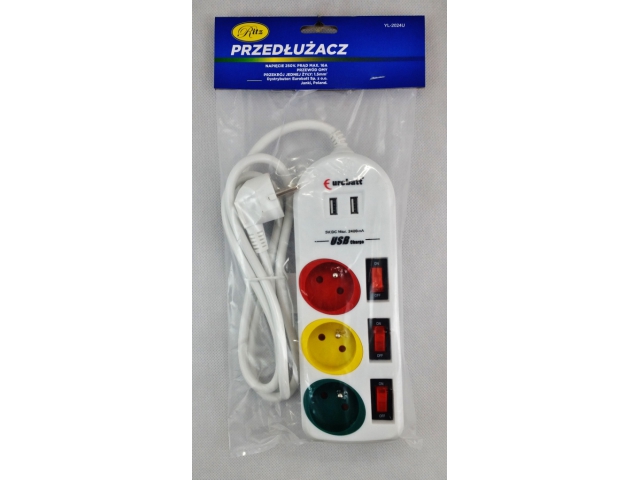 Подовжувач, подовжувач, 3 розетки, 3 вимикачі + 2xUSB, 1,5 м кольоровий