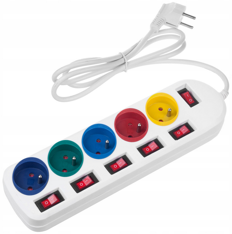Подовжувач живлення з5 розетками дозволяє підключати до п'яти повнорозмірних вилок одночасно. Він має захист від дітей, вимикач з підсвічуванням і окремі вимикачі для кожної розетки.