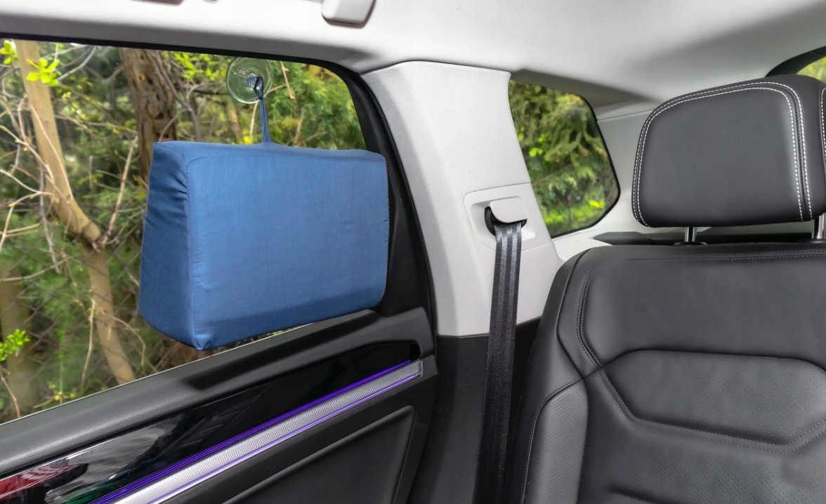 Цю «міні» дорожню подушку можна легко прикріпити до лобового скла завдяки присосці.