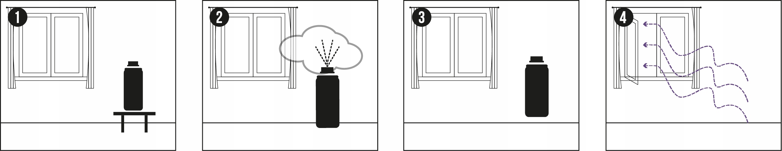 Упаковку препарату розташовувати в центральній частині приміщення на будь-якій висоті. Нанесіть засіб, міцно натиснувши на аплікатор до фіксації, тримаючи контейнер у прямій руці, якомога далі від обличчя, щоб уникнути впливу вертикального струменя аерозолю. Залиште контейнер для спорожнення, вийдіть і закрийте приміщення на 1 годину.