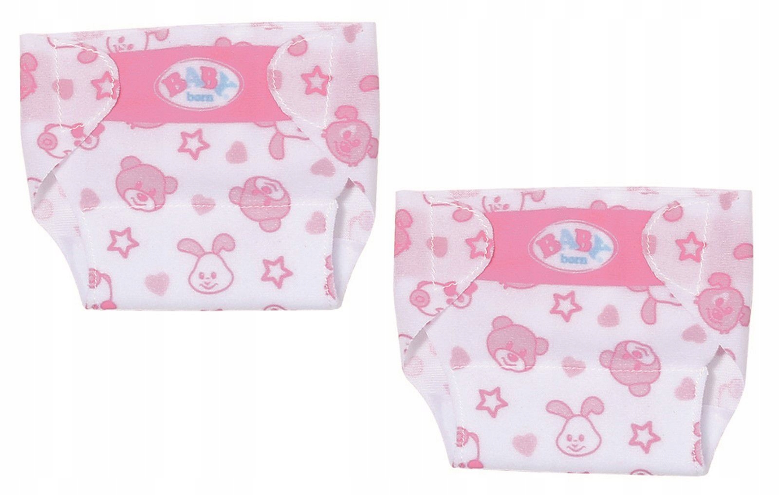 Чудові підгузки для вашого BABY Born. М'який біло-рожевий матеріал забезпечить комфорт, а дві застібки-липучки подбають про те, щоб підгузник не зрушувався, що б не сталося. Завдяки милим принтам із рожевими зірочками, сердечками та щасливими обличчями ведмедя Бруно, кролика Бенно, собаки Белло та качки Берти ваша лялька більше не соромиться показувати свій підгузок на публіці