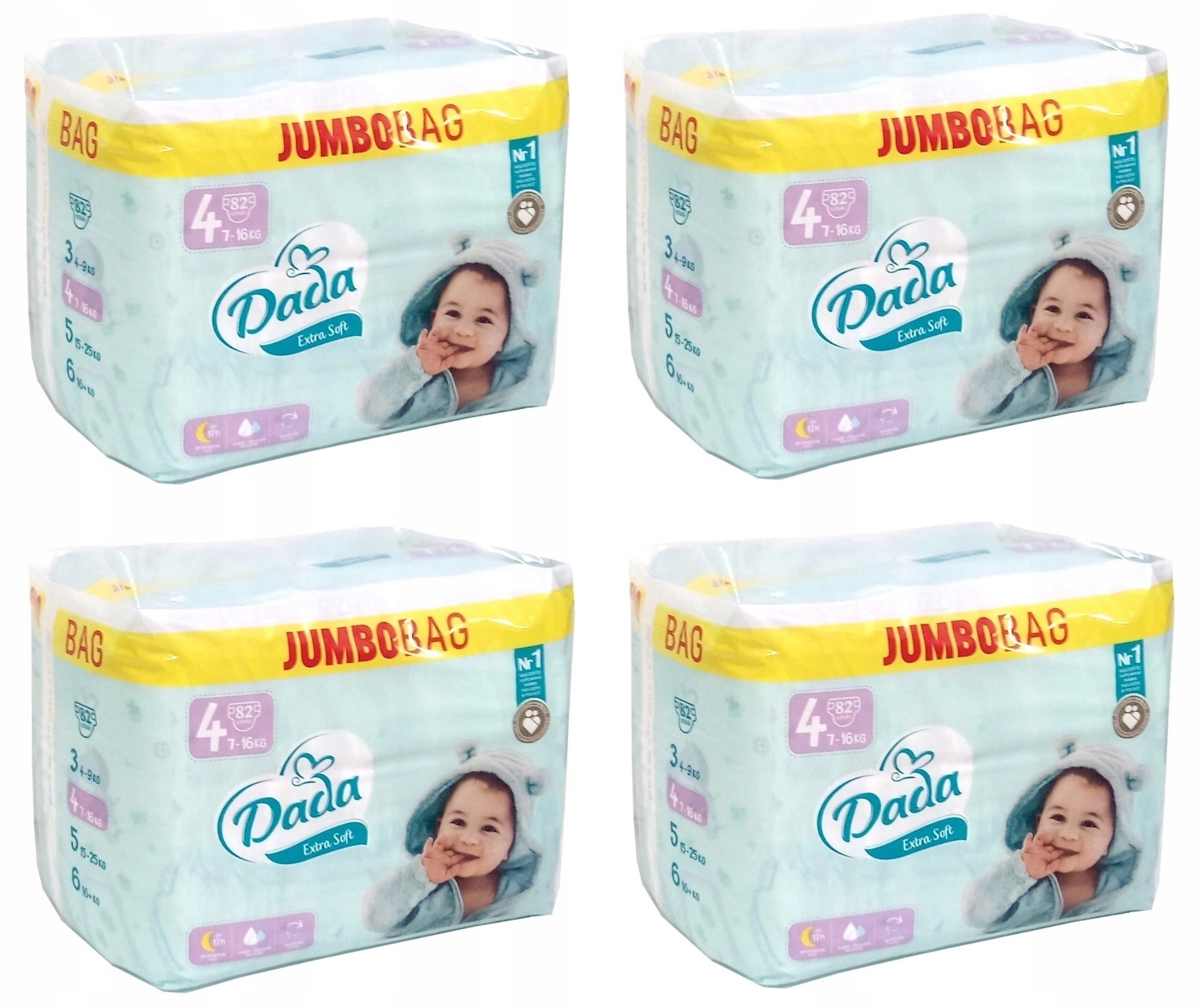 Підгузки Dada Extra Soft 4 розміру призначені для дітей вагою 7-16 кг. Підгузки, створені у співпраці з Інститутом матері та дитини, забезпечують комфорт (до 12 годин висихання), ніжні, м'які, захищають від стирання та мають розтяжні боки, що забезпечує свободу рухів. Формула забезпечує в 2 рази швидше поглинання завдяки використанню суперабсорбуючих каналів. Пелюшки мають широкі кольорові застібки, які полегшують їх зміну. Анатомічна форма забезпечує кращу посадку, а м'який внутрішній шар (екстракт алое) забезпечує м'якість, ніжність і легкість. Вони також мають спеціальні рюші по краях, що забезпечують додатковий захист. Підгузки не ароматизовані, що знижує ризик подразнення та алергії. Підгузки мають позитивний висновок Інституту матері та дитини.