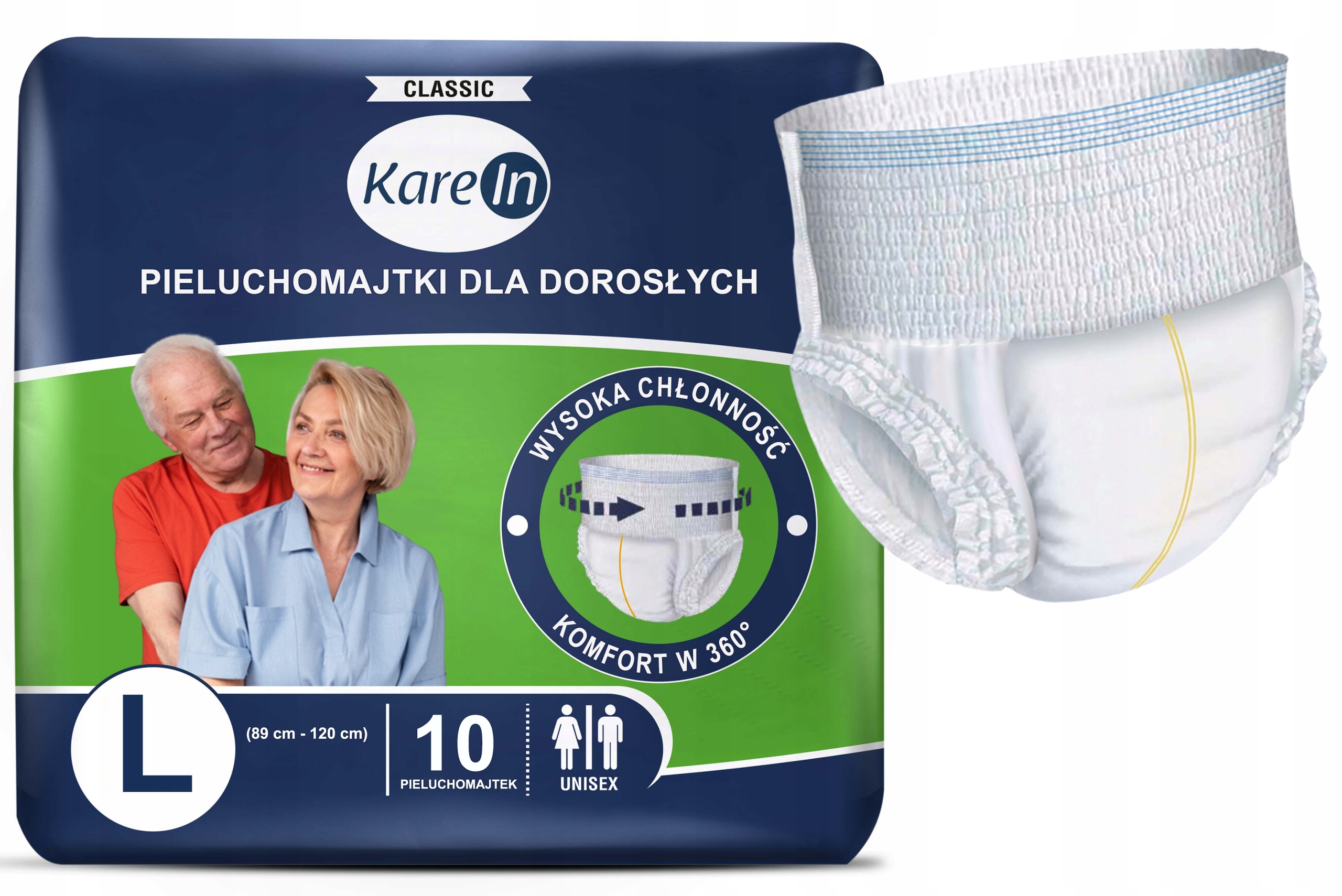 Підгузки KareIn Classic – унікальне та комфортне рішення для людей, які потребують захисту та комфорту. Ці високоякісні штанці-підгузники характеризуються ідеальною посадкою по тілу, що забезпечує впевненість і комфорт протягом усього дня. KareIn Classic забезпечує не тільки ефективне поглинання, але й захист від протікання протягом 10 годин.