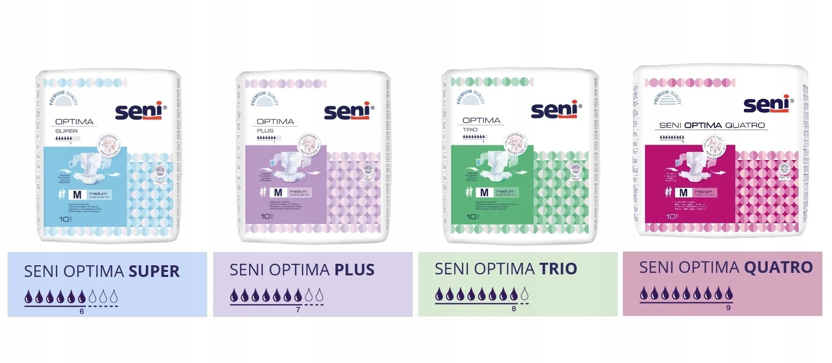 Seni Optima Super - підгузки з регульованим стегновим поясом. Вони поєднують в собі переваги анатомічних підгузників і традиційних підгузників. Особливо рекомендовані людям із ожирінням.
