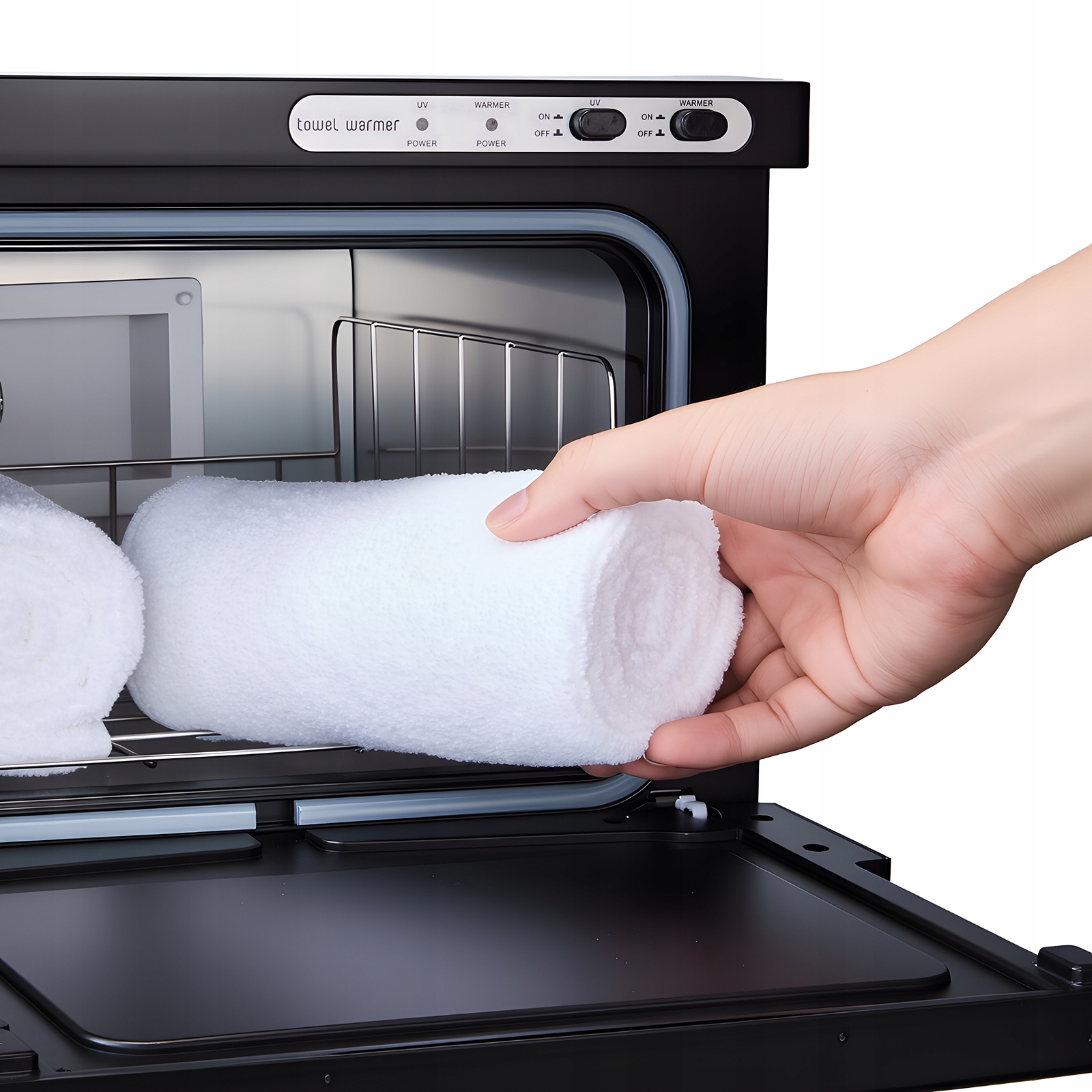 Оснащена лампою для очищення та іншими професійними пристроями для дезінфекції, наша рушникосушка забезпечує повну дезінфекцію. Це гарантує, що рушники завжди залишаються чистими та свіжими, готовими до використання в місцях з високими стандартами чистоти, наприклад у салонах і готелях.