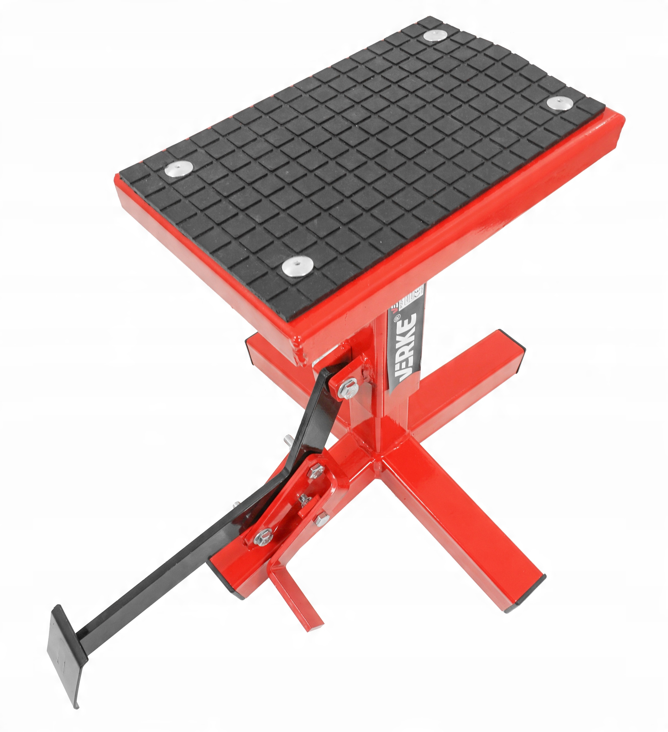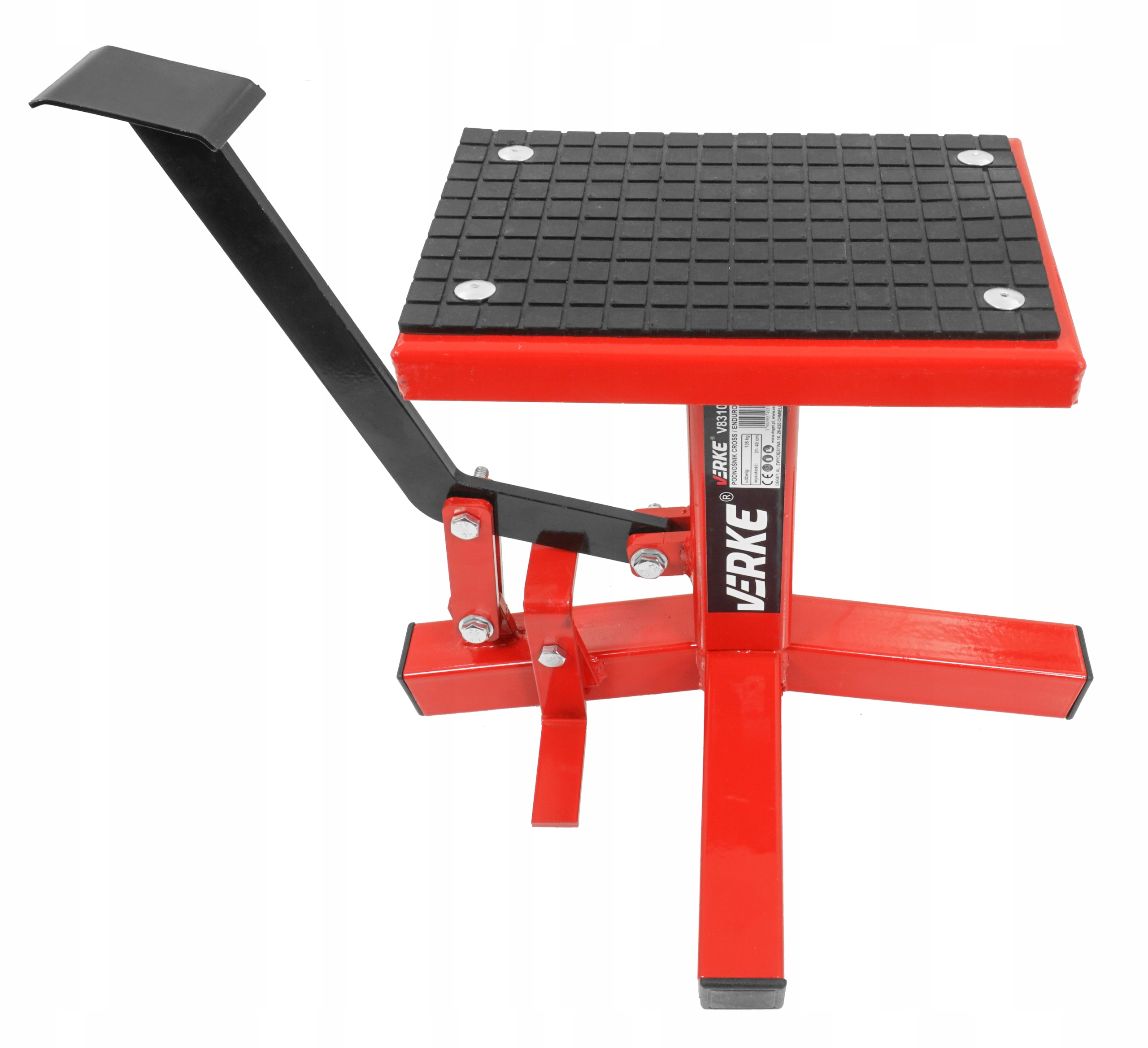 Універсальний підйомник, призначений для кросових, ендуро та триальних мотоциклів. Простий у використанні, легкий і портативний, він дозволить легко ремонтувати безпечним і ефективним способом, а також значно полегшить миття мотоцикла. Високоякісна сталь, використана для виготовлення конструкції, забезпечить її довговічність і стабільний і безпечний підйом мотоцикла. Використання антиковзаючої гуми забезпечує високу безпеку та комфорт роботи.