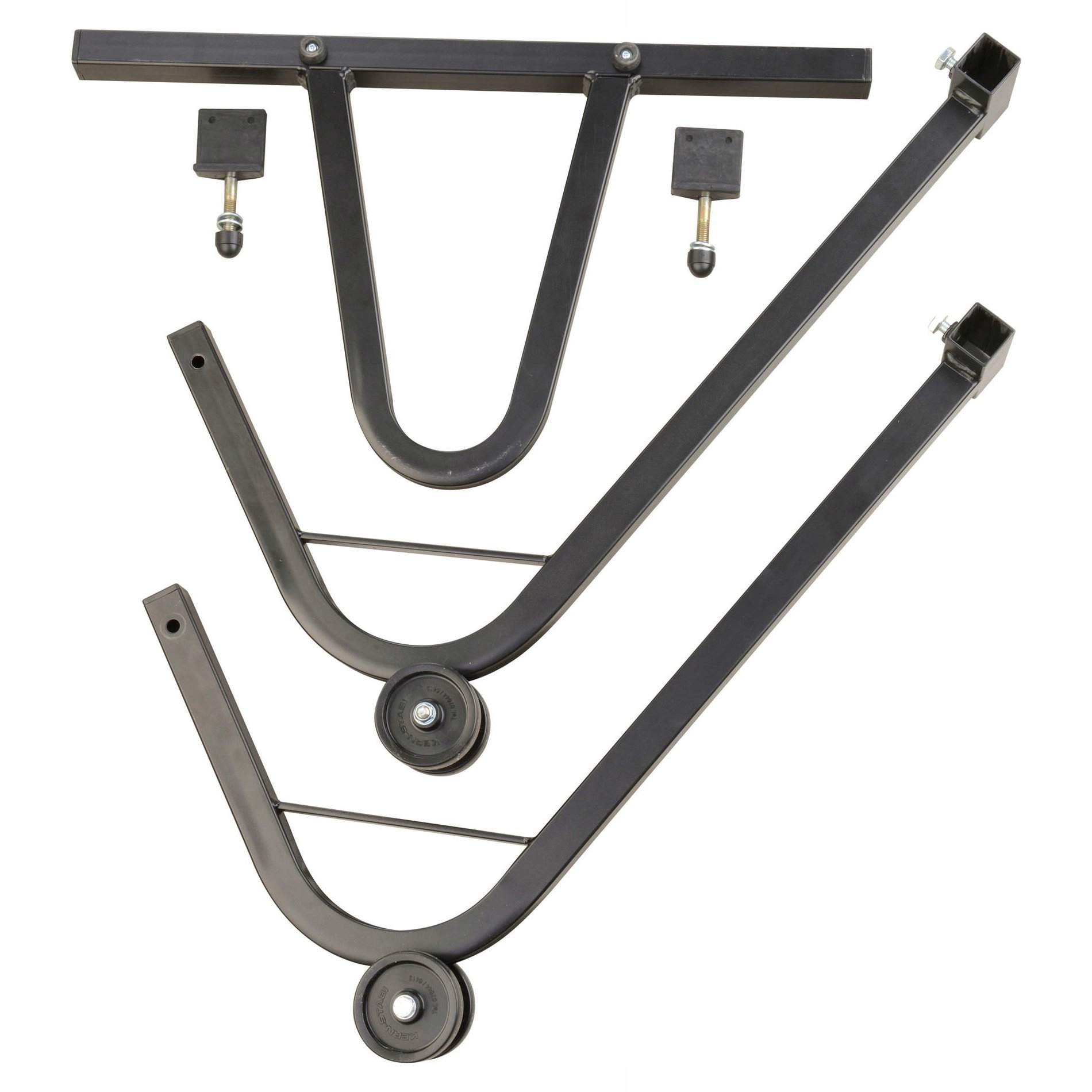 Міцна кутова конструкція з порошковим покриттям робить цей підйомник високою стабільністю та довговічністю. Стійкі подвійні колеса та довгий важіль (приблизно 90 см) дозволяють легко піднімати та опускати. Велика (U-подібна) ручка дозволяє розмістити домкрат спереду на поворотному кронштейні, якщо це необхідно. Протиковзкі прогумовані накладки забезпечують надійне кріплення поперечних важелів і ефективно запобігають подряпинам. Підйомник дуже швидко розбирається на частини, тому для нього знайдеться місце навіть у найменшій майстерні та гаражі.