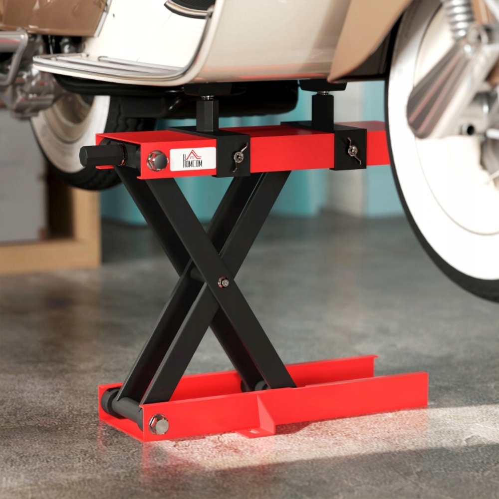 Стійкий підйомник-ножиці: оснащений подвійною сталевою конструкцією з ножицями для безпечного підйому та двома знімними опорними сідлами, які міцно тримають мотоцикл на місці.