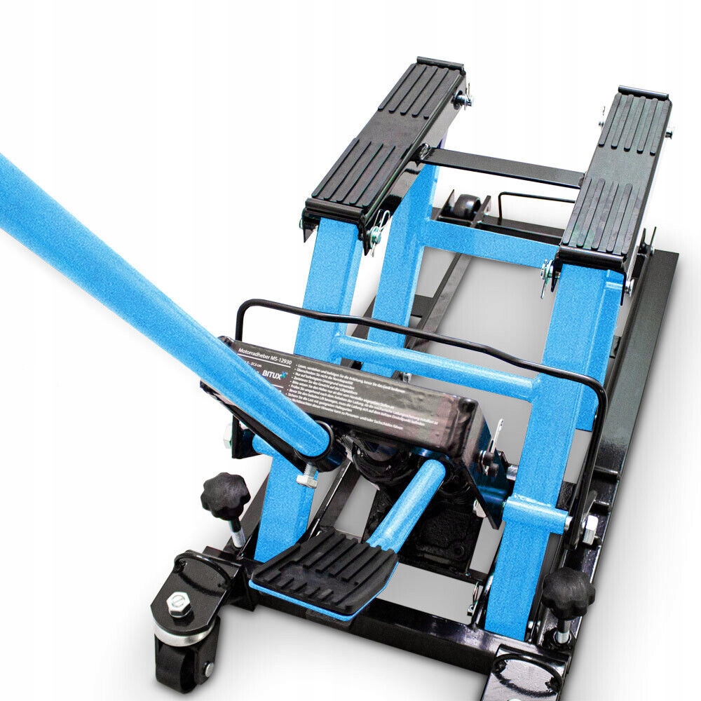 Професійний гідравлічний підйомник оснащений ножною педаллю, яка дозволяє піднімати мотоцикл без застосування великої сили. Підйомник виготовлений з високоякісних матеріалів. Кронштейни покриті протиковзкою гумою, щоб уникнути пошкоджень під час експлуатації. Сталеві профілі з 2 опорними і 2 поворотними колесами забезпечують легке маневрування.