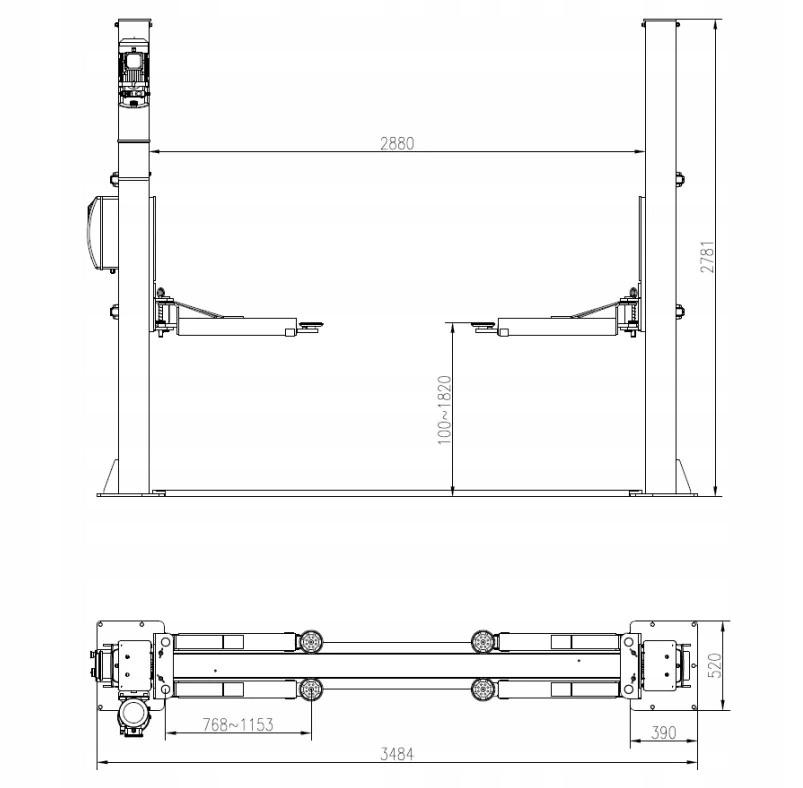 Технічні дані Параметр Значення Висота підйому 1820 мм Ширина проїзду 2510 мм Швидкість підйому 50 секунд Мінімальна висота 100 мм Загальна висота 2781 мм Загальна ширина 3484 мм Довжина плеча 768 – 1153 мм (двоступінчатий) Потужність двигуна 2,2 кВт Рівень шуму 85 дБ Живлення 230 В
