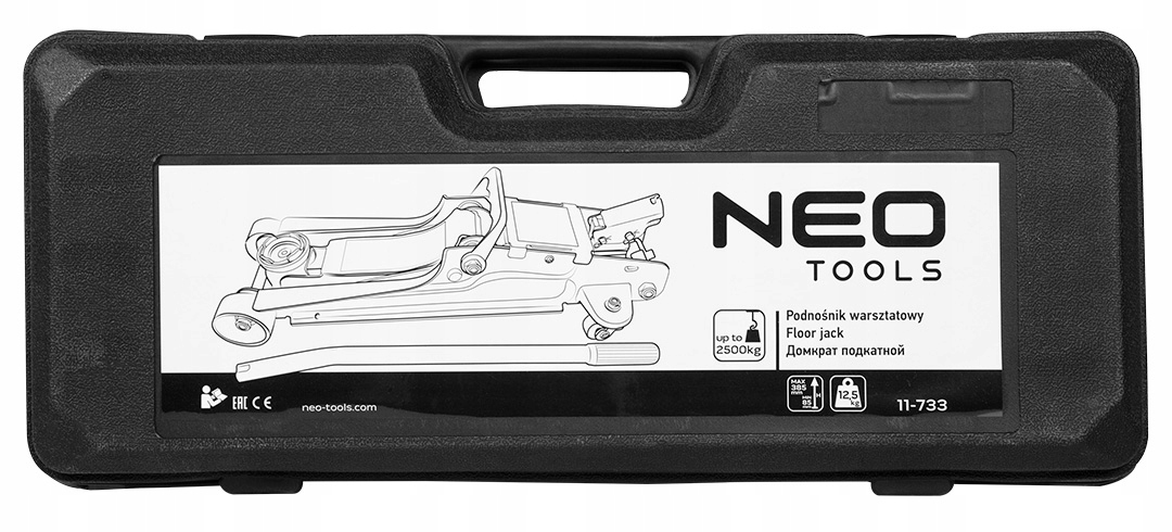 Підйомник для майстерень жабка 2,5 т 11-733 фірми NEO TOOLS - це підйомник, призначений для підйому транспортних засобів вагою до 2,5 тонн. Має діапазон підйому від 85 до 385 мм, що забезпечує легку посадку під порогом. Його загальна вага становить 12,5 кг. Підйомник NEO TOOLS оснащений чотирма практичними колесами (включаючи два поворотних), які полегшують транспортування. Міцна сталева конструкція забезпечує тривале використання. Невелика початкова висота інструменту дозволяє підсунути домкрат під будь-який автомобіль, а ручка для перенесення полегшує роботу. Підйомник пропонується в комплекті з пластиковою валізою.