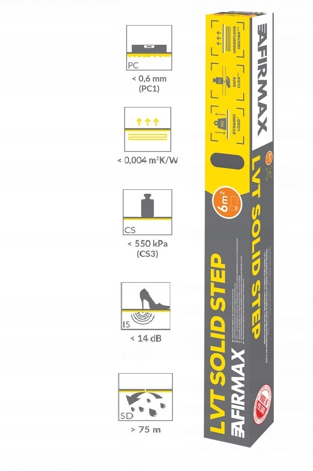 Підкладка для підлоги Afirmax LVT Solid Step 1,1 м 6 м2 використовується для панелей, встановлених з натисніть. Використовується для вінілових і ламінованих панелей. Панелі можна використовувати в приміщеннях з великою прохідністю. Виріб характеризується низькою термостійкістю. Грунтовка також захищає від вологи. Підкладка виготовлена з поліуретану та мінералів і забезпечує додаткову акустичну ізоляцію.
