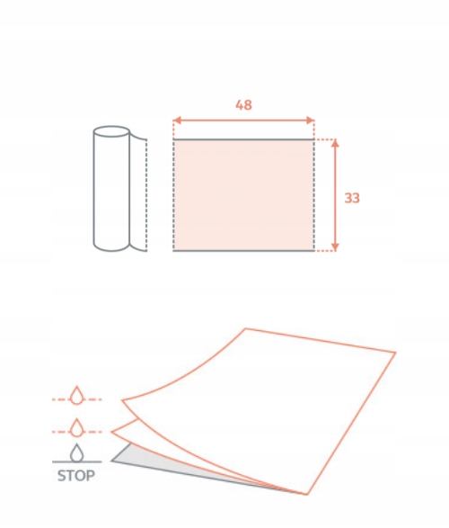 Два шари паперові роблять серветки вбираючими, а додатковий шар фольги робить їхводонепроникними. Форма рулону дозволяє вільно зберігати та легко використовувати. Перфорація між серветками полегшує розділення окремих серветок.