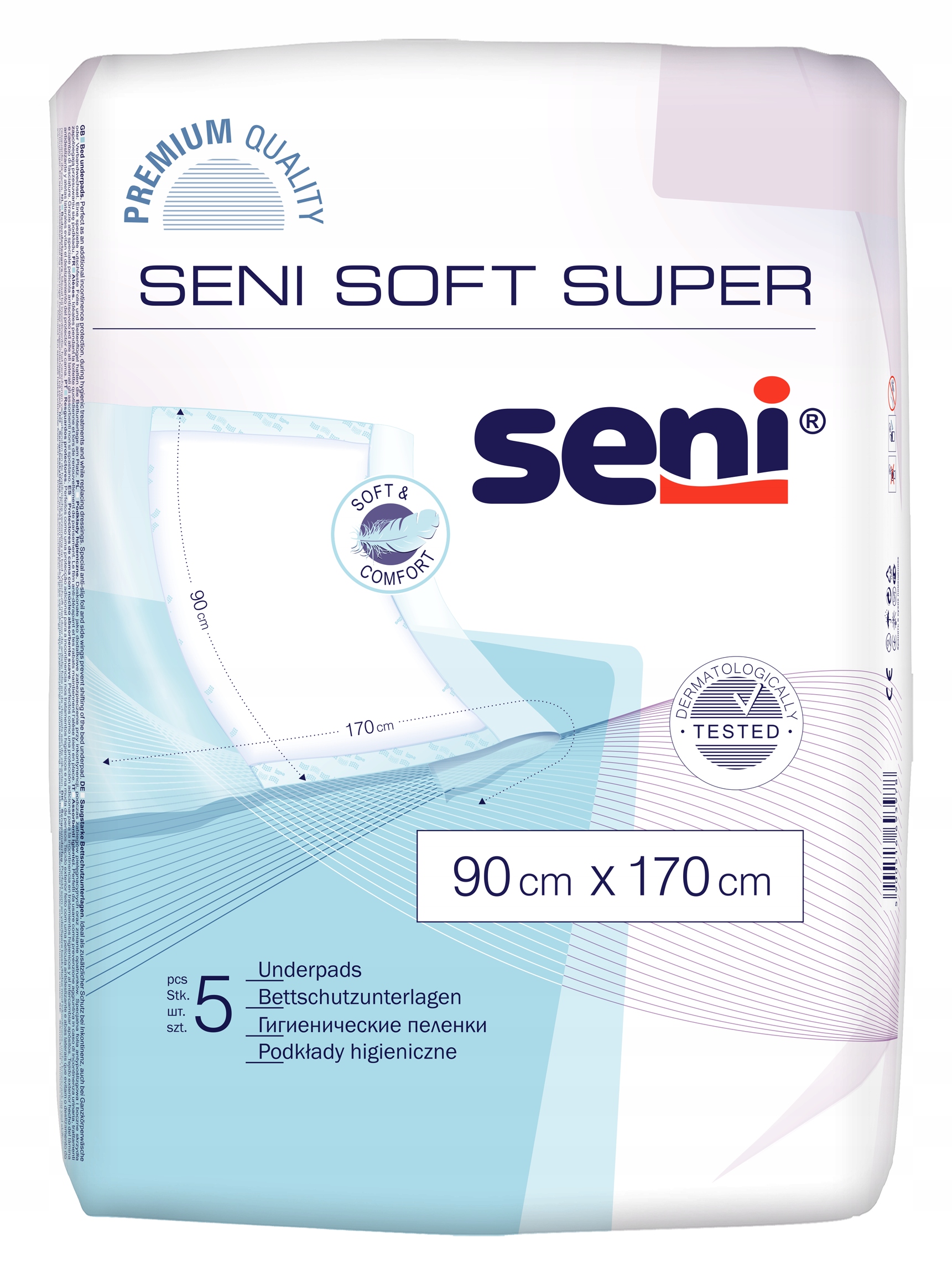 Гігієнічні прокладки Seni Soft розміром 90 см х 170 см мають абсорбуючу вставку розміром 90 см х 60 см. Інша частина - бічні крила, загорнуті під матрац, які додатково перешкоджають пересуванню підкладки по ліжку.