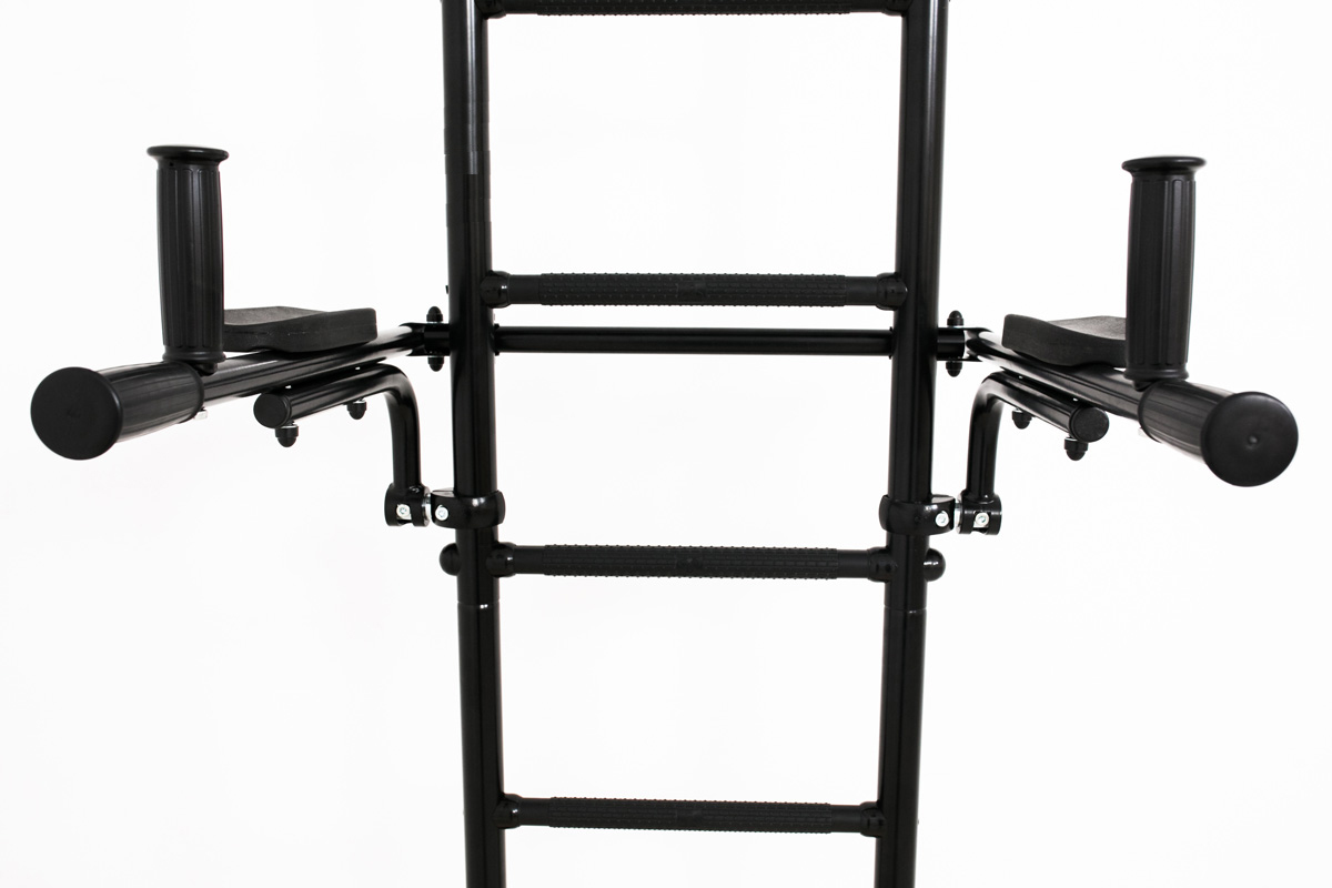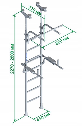 Абсолютна простота монтажу розсувної драбини дозволяє легко перенести її в інше місце в майбутньому. Розсувна система кріплення дозволяє уникнути свердління отворів у стінах і дозволяє встановлювати драбину в приміщеннях висотою від 227 см до навіть 325 см після подовження драбини додатковими 2 ступенями. Розсувний варіант підлаштовується під висоту квартири і дозволяє максимально використовувати весь простір в кімнаті, який ми відвели під цей спортивний інвентар. Система розширювального монтажу є безпечною та сертифікованою для використання як дітьми, так і дорослими - вона передбачає телескопічне висування металевих вставок від стійок драбини до рівня стелі, а після фіксації вставок ми відкручуємо розпірний гвинт, який розширює гімнастичний набір між літаків якомога більше. Сходи з'єднані зі стелею чотирма елементами діаметром 8 см.