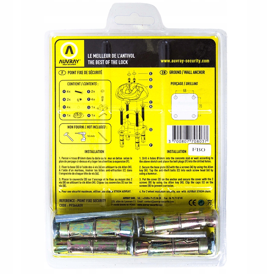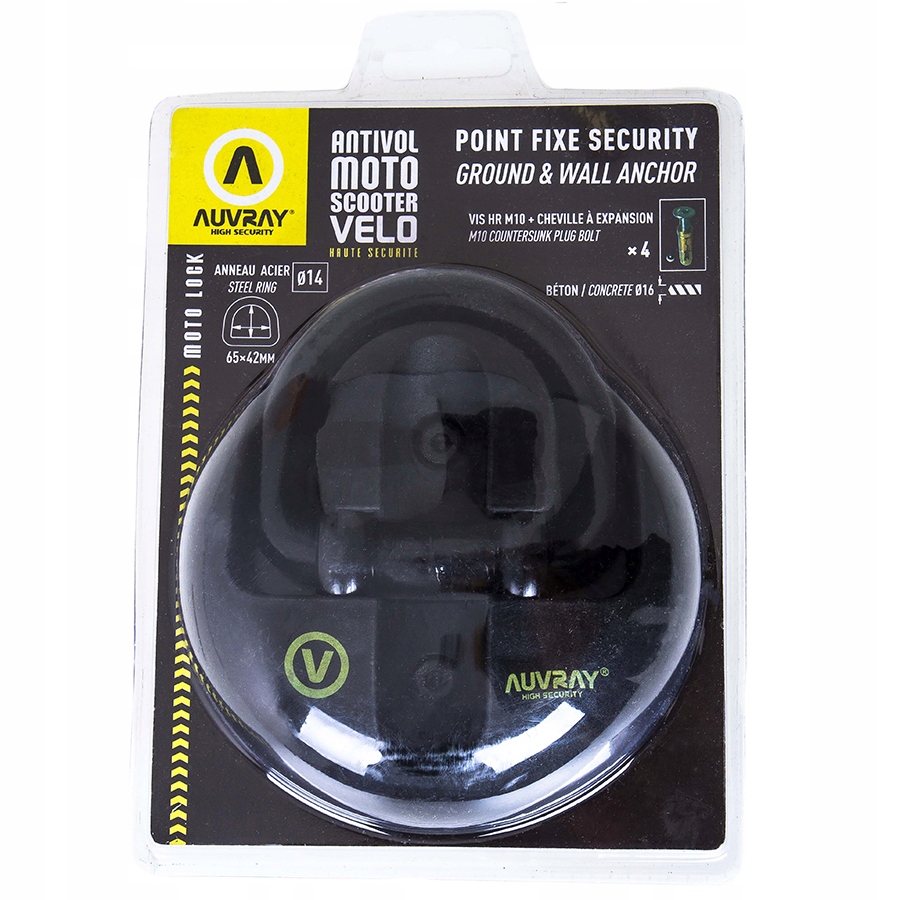 Бетонні анкери від французької компанії Auvray є чудовим рішенням для людей, які шукають легкий- монтажний тримач для захисту двоколісного автомобіля від крадіжки. Проста конструкція (плоске відкидання «вушка») і гвинтове кріплення дозволяє швидко обладнати гараж або стоянку міцною, не потребує обслуговування зчіпкою.