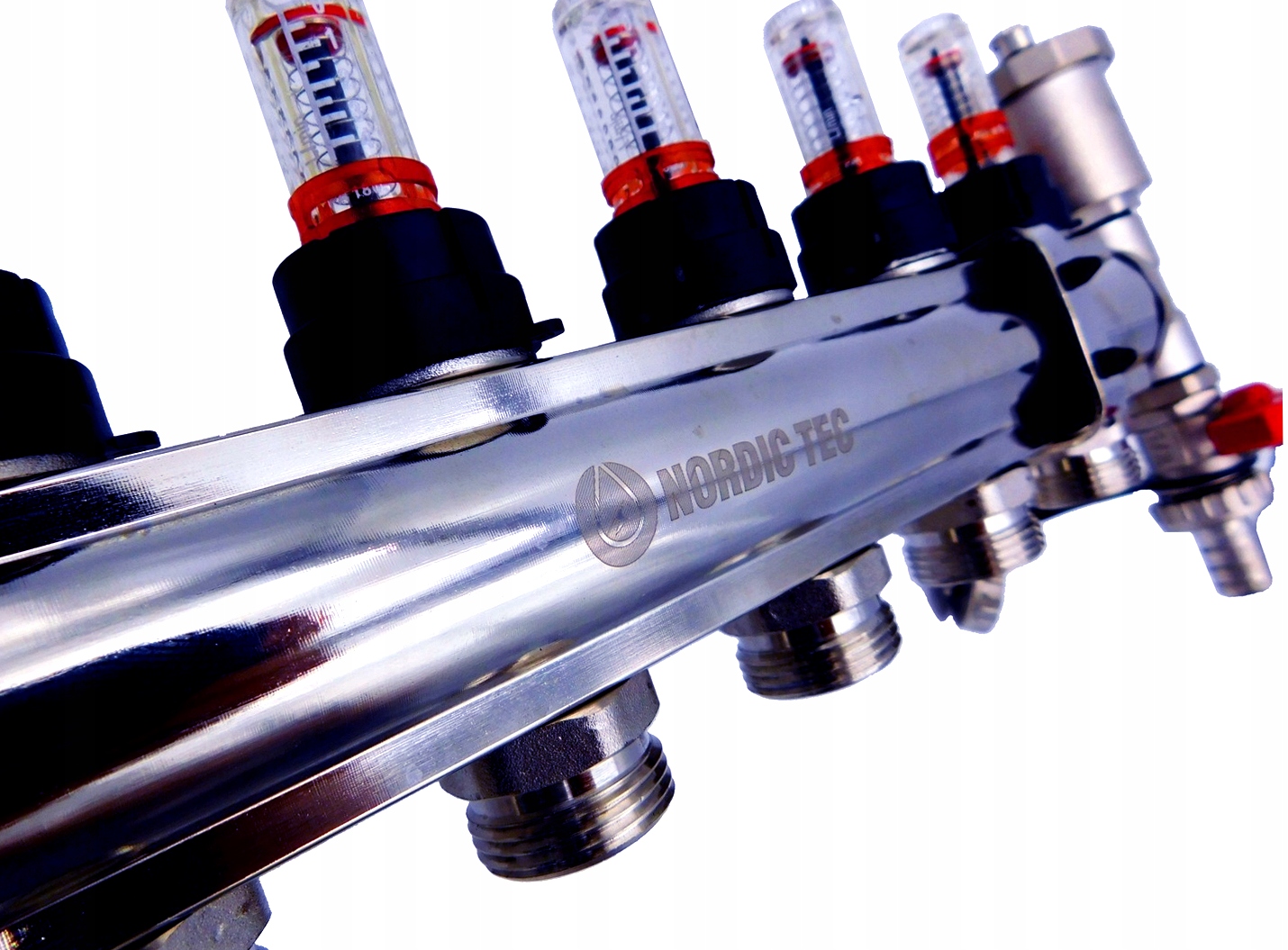 Розподільник центрального опалення NORDIC TEC, 7 секцій з 2 кутовими клапанами та термометрами