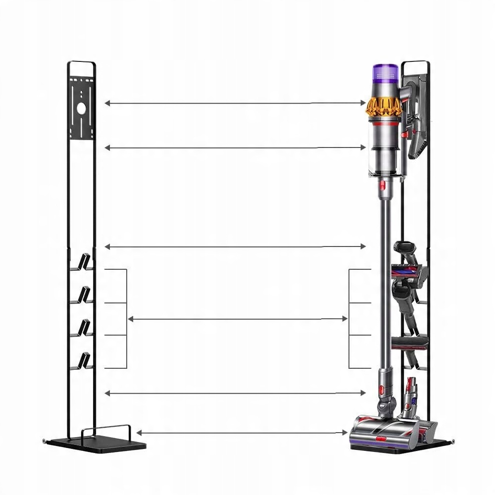 Металева підставка для зберігання пилососа, зроблена з міцного і якісного матеріалу металу, надійний і довговічний. Вигнутий випрямляч розташований у формі башти, яка ідеально вміщує всі аксесуари підставки для пилососа Dyson.
