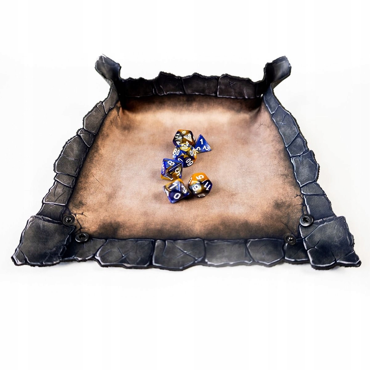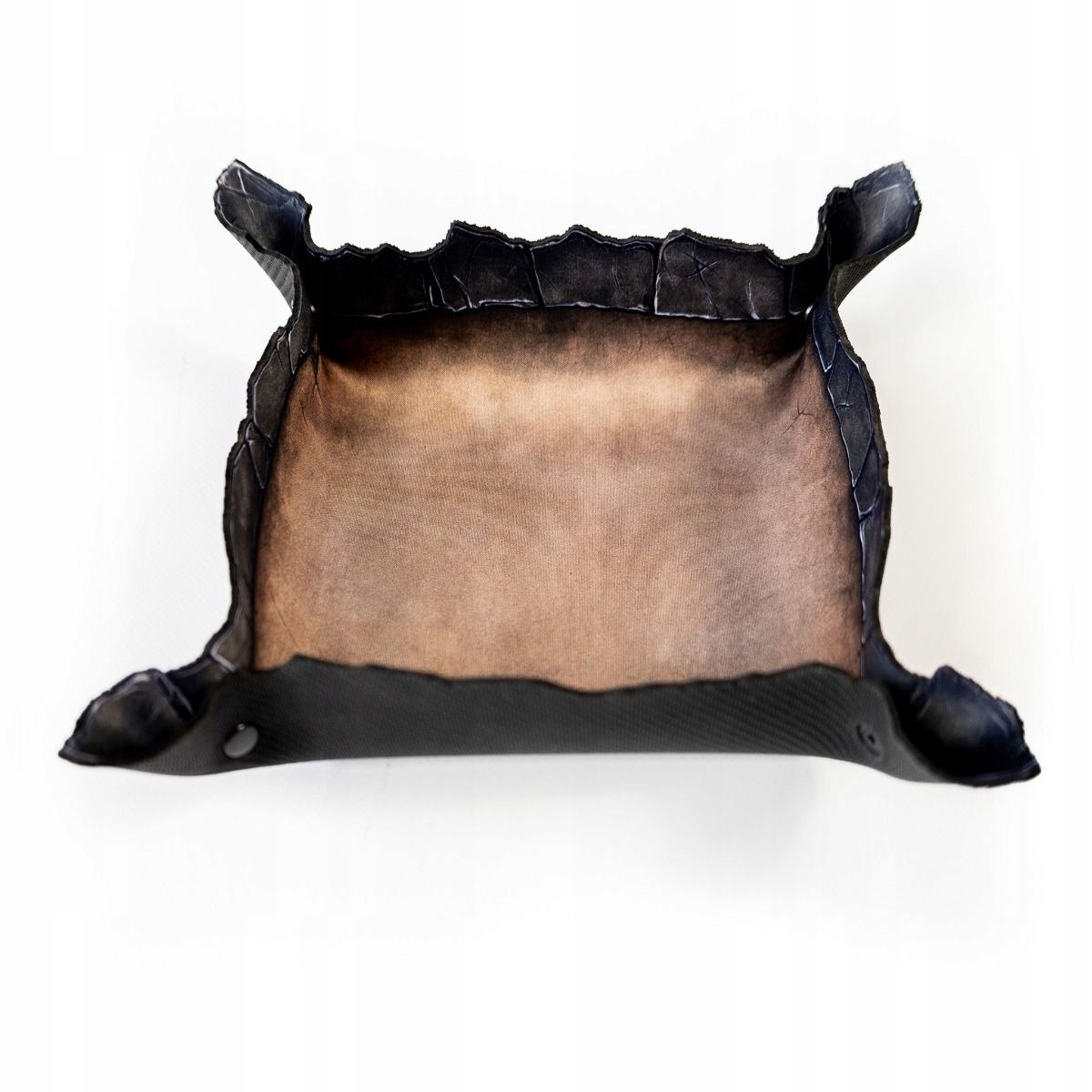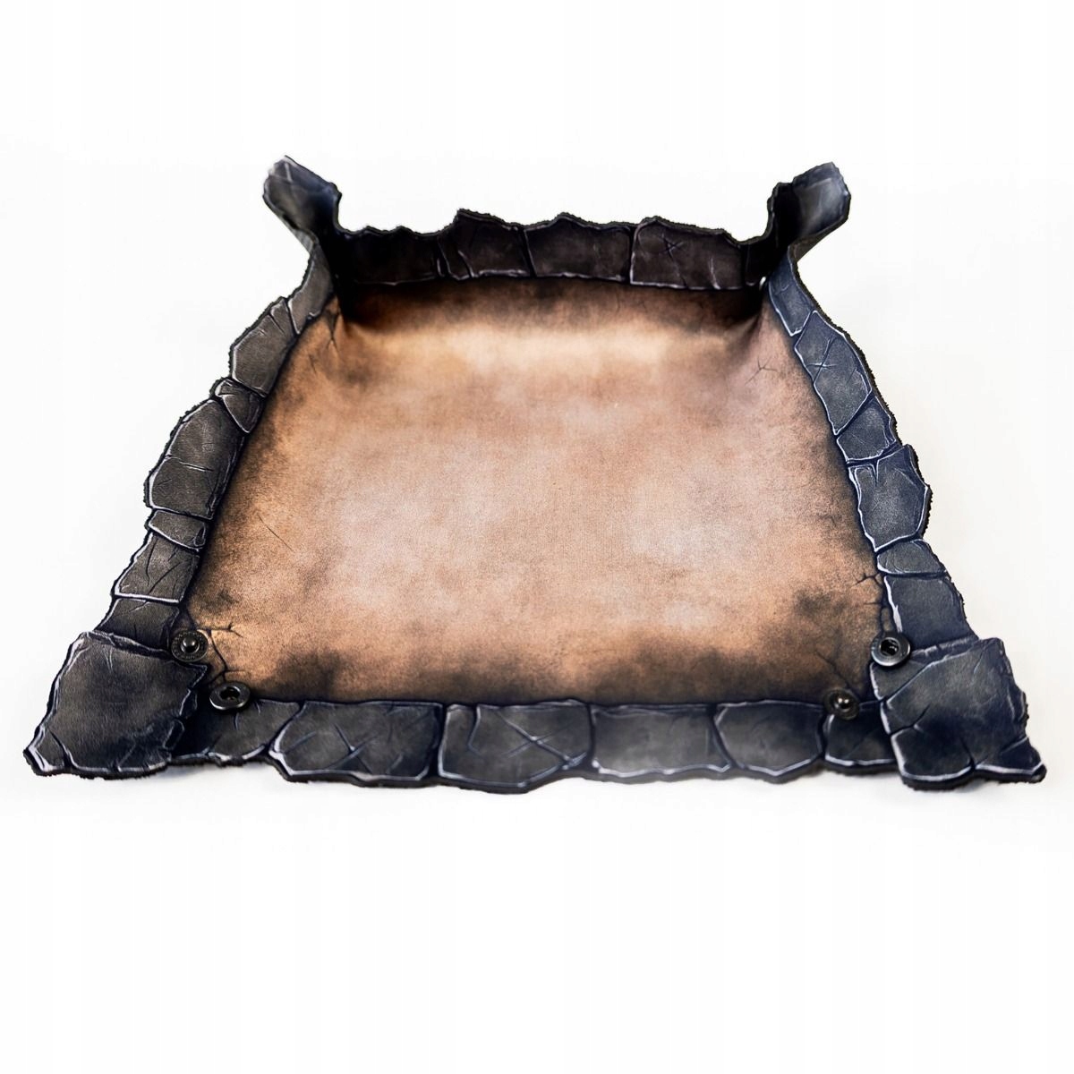 Виготовлений із міцної гуми товщиною 2 мм, піднос стійкий до зминань, катання в рюкзаку та невдалих кидків. Внутрішня поверхня з одностороннім принтом зістареного коричневого кольору нагадує старий вицвілий камінь. Але справжньою перевагою є краї - їх форма не випадкова. Нерегулярні, схожі на тріщини тріщини на краю скелі створюють атмосферу та природним чином зупиняють кочення кубів.