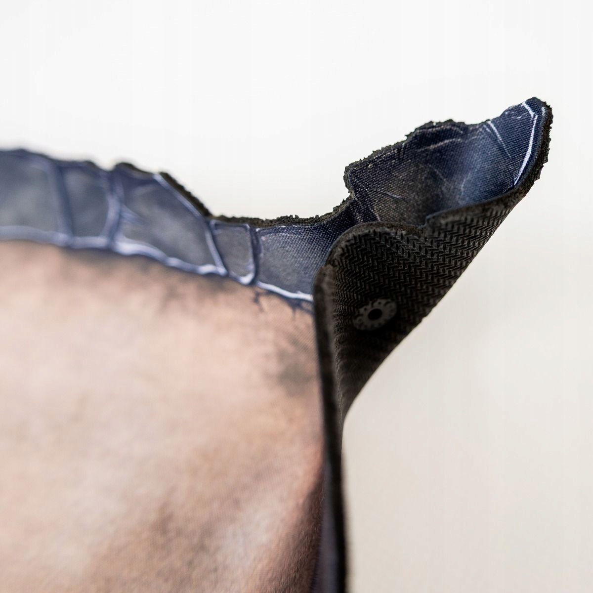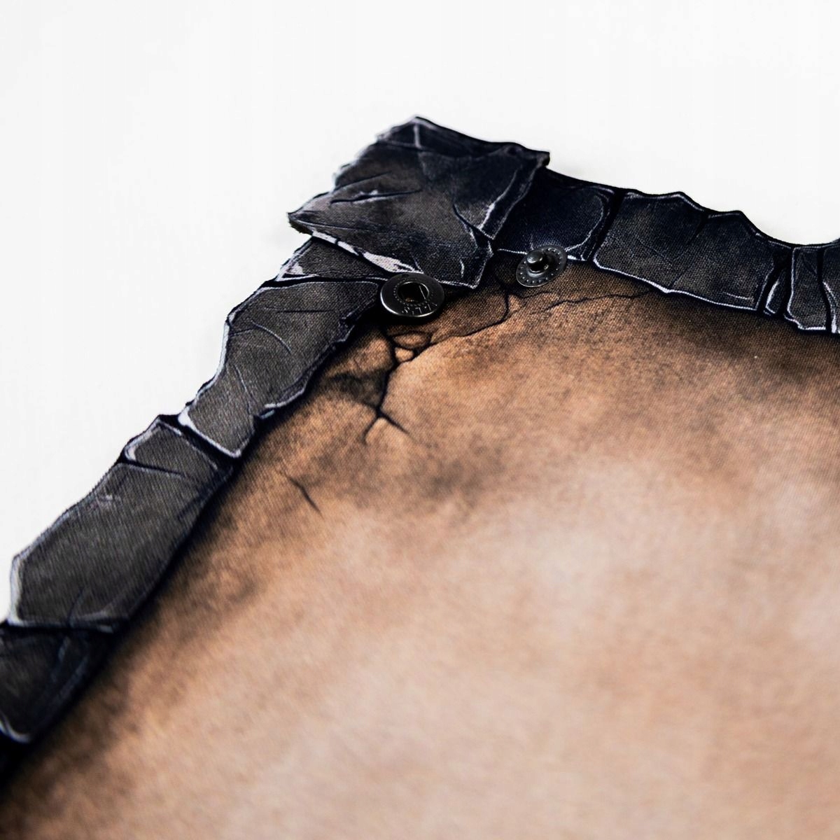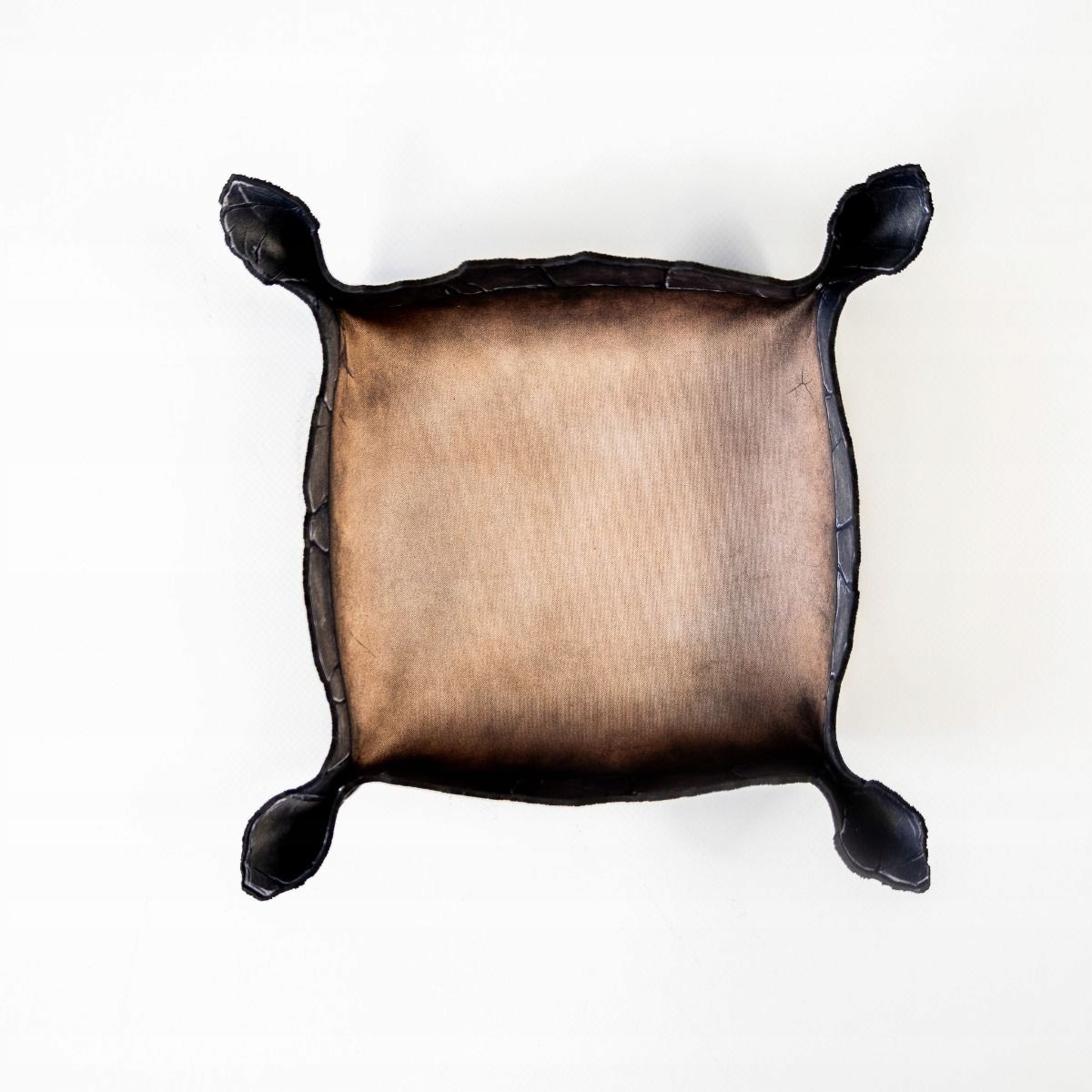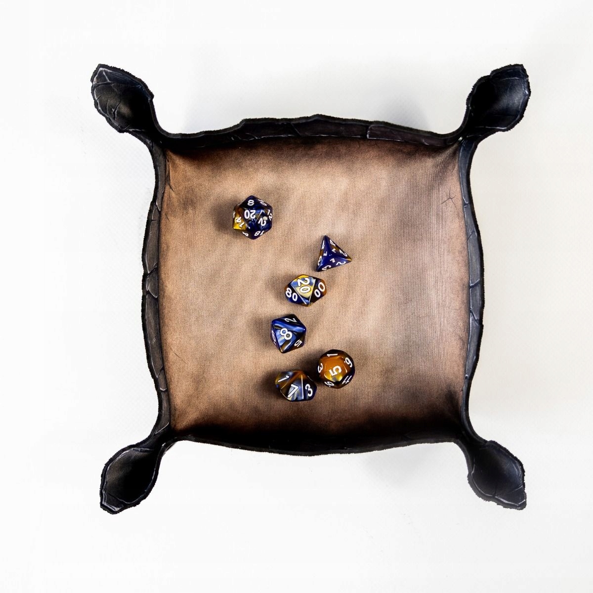 Виготовлений із міцної гуми товщиною 2 мм, піднос стійкий до зминань, катання в рюкзаку та невдалих кидків. Внутрішня поверхня з одностороннім принтом зістареного коричневого кольору нагадує старий вицвілий камінь. Але справжньою перевагою є краї - їх форма не випадкова. Нерегулярні, схожі на тріщини тріщини на краю скелі створюють атмосферу та природним чином зупиняють кочення кубів.