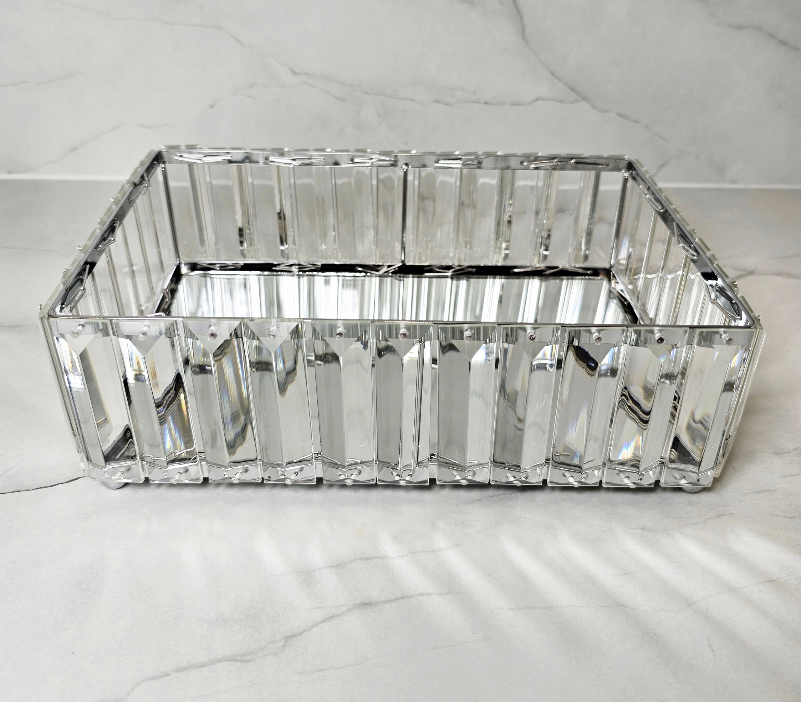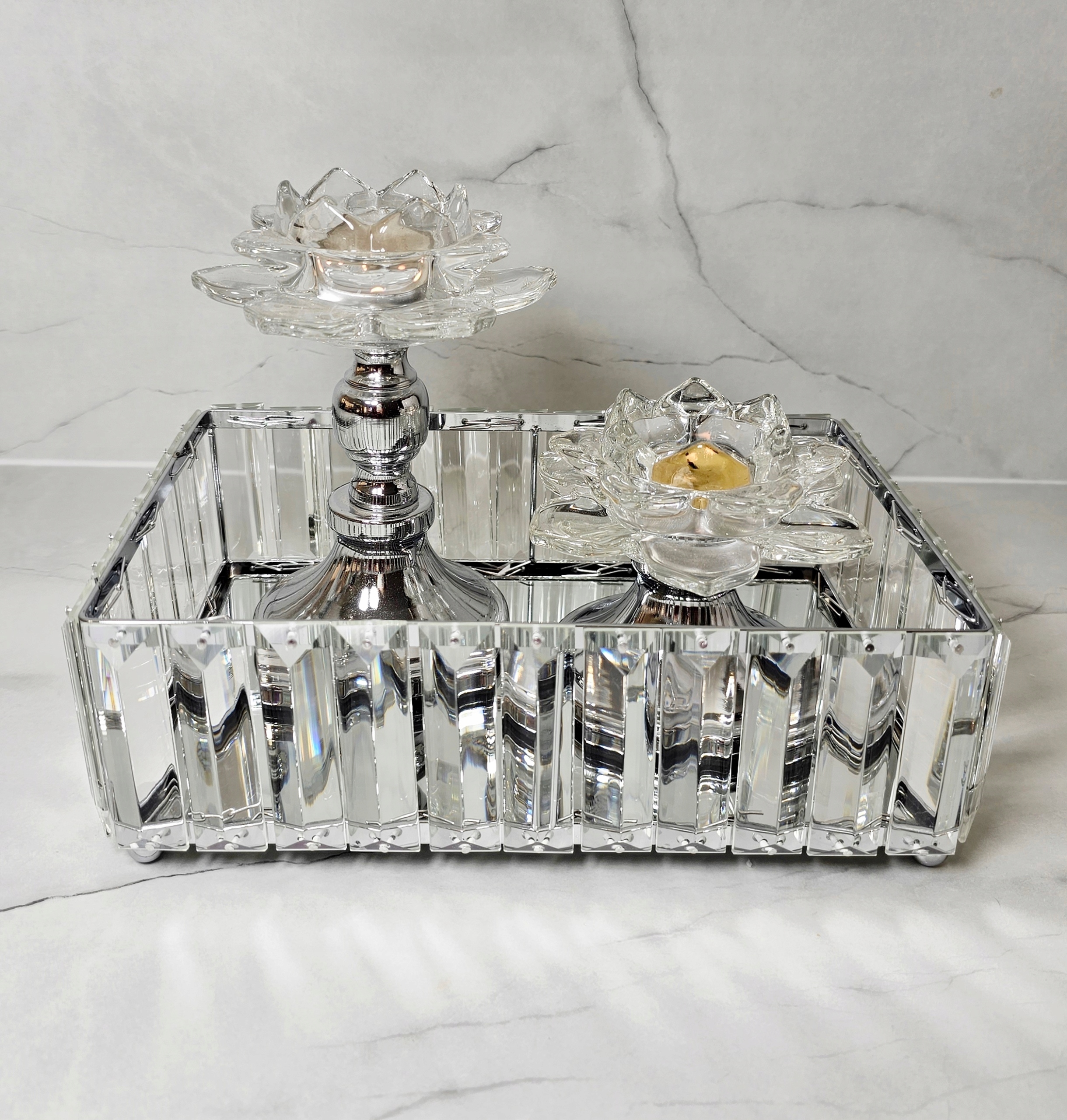 Гарна дзеркальна підставка з великими кристалами. Продукт, який рекомендують і охоче обирають клієнти як елемент столу з солодощами та випічкою для урочистих подій. Він також може виконувати декоративну роль у поєднанні зі свічками та декоративними ємностями. Чудово виглядає як декоративна основа для косметики та парфумів.