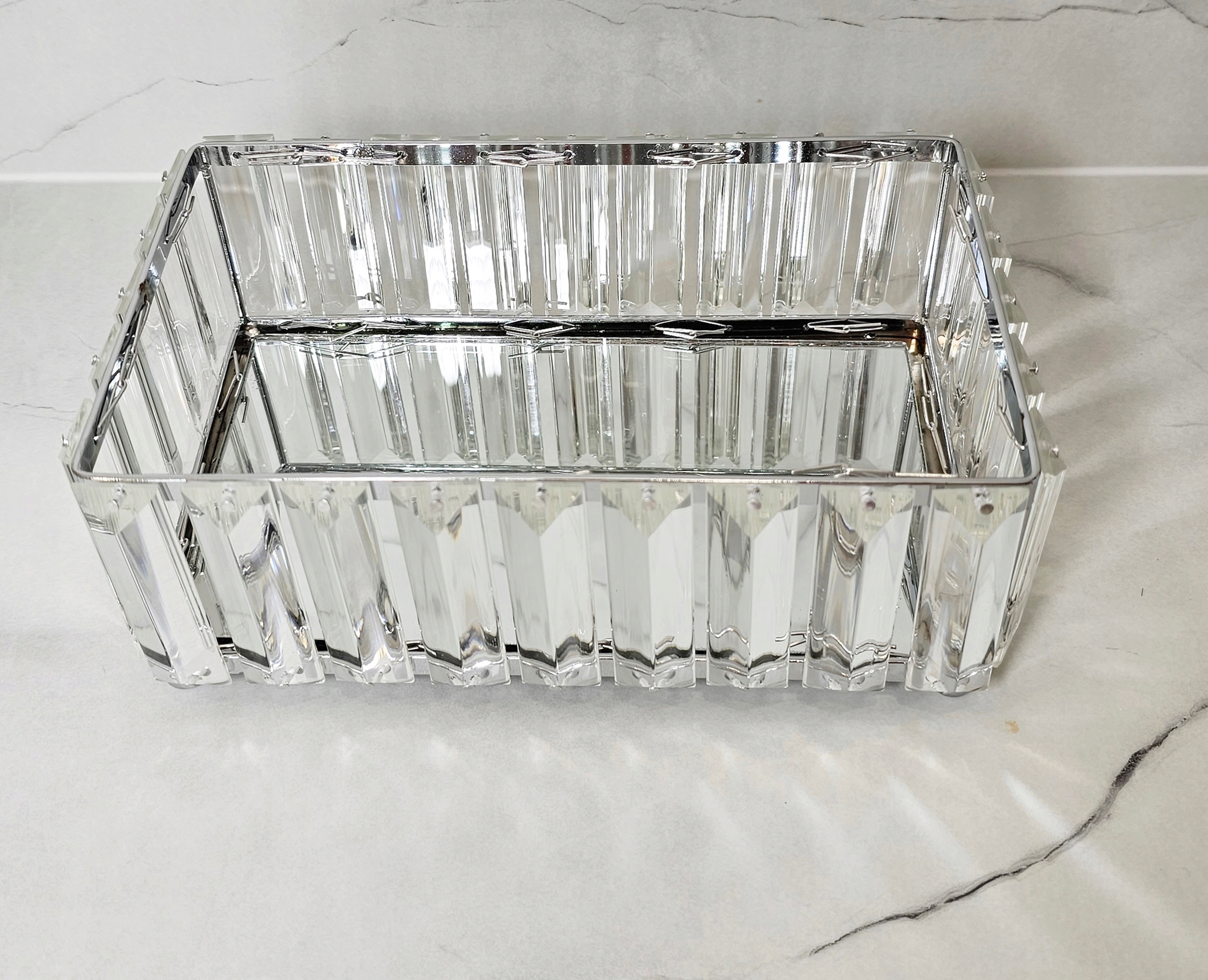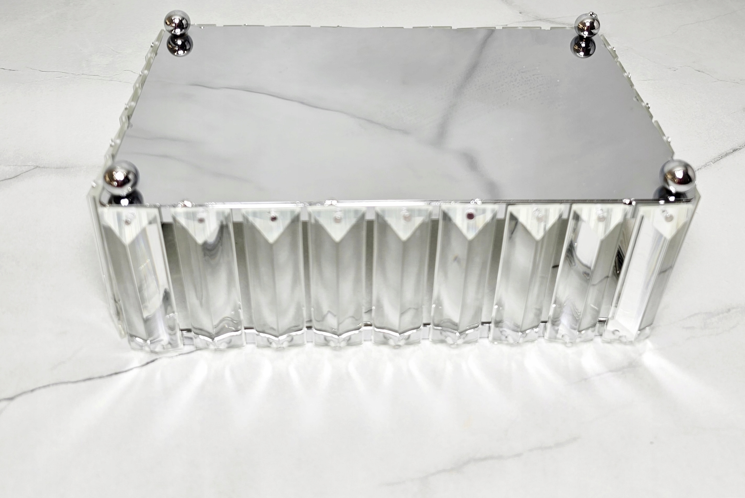 Красива дзеркальна підставка з великими кристалами. Продукт, який рекомендують і охоче обирають клієнти як елемент столу з солодощами та випічкою для урочистих подій. Він також може виконувати декоративну роль у поєднанні зі свічками та декоративними ємностями. Чудово виглядає як декоративна основа для косметики та парфумерії.