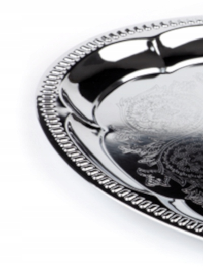 Хромована овальна таця для сервірування срібла. Ідеально підходить для подачі кави. Декорований крайдодає йому елегантності та витонченості. Використовуйте його у своєму ресторані чи кафе. Піднос дуже красиво виглядає на фуршетних столах.