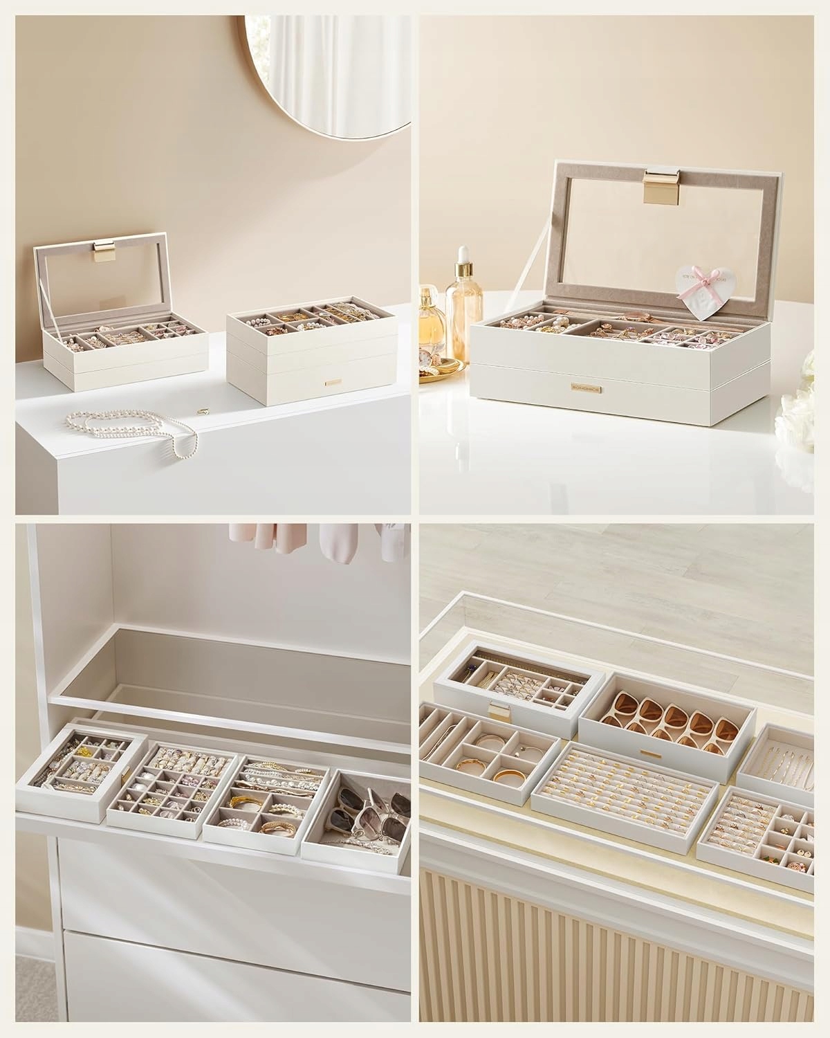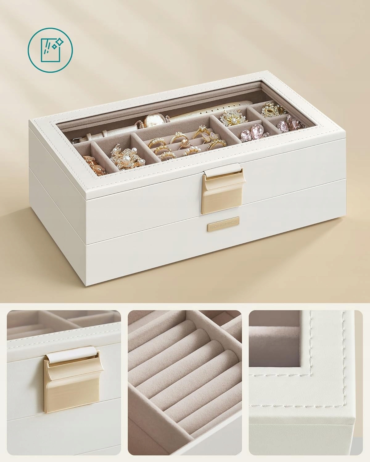 ✅ Продумані деталі: Стильна прозора скляна кришка полегшує пошук ваших прикрас і захищає їх від пилу. Завдяки поглибленням у нижній частині рівні можна стабільно встановлювати один на одного, економлячи простір.