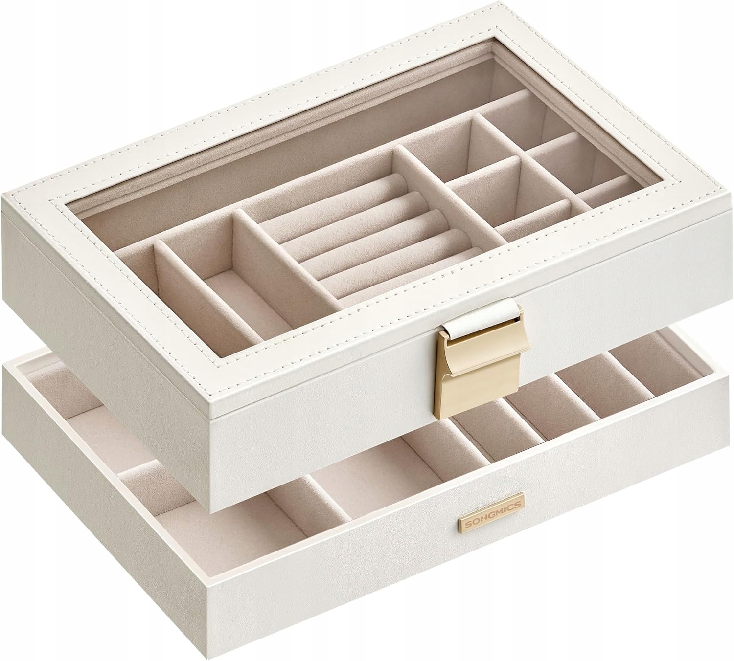 Шкатулка для ювелірних виробів 2 рівні, піднос для ювелірних виробів, який можна штабелювати, велика скринька для ювелірних виробів, шкатулка для коштовностей зі скляною кришкою, 17 x 28 x 8,8 см, біла, вставка для ювелірних виробів для шухляд, ідеальна ідея для подарунка