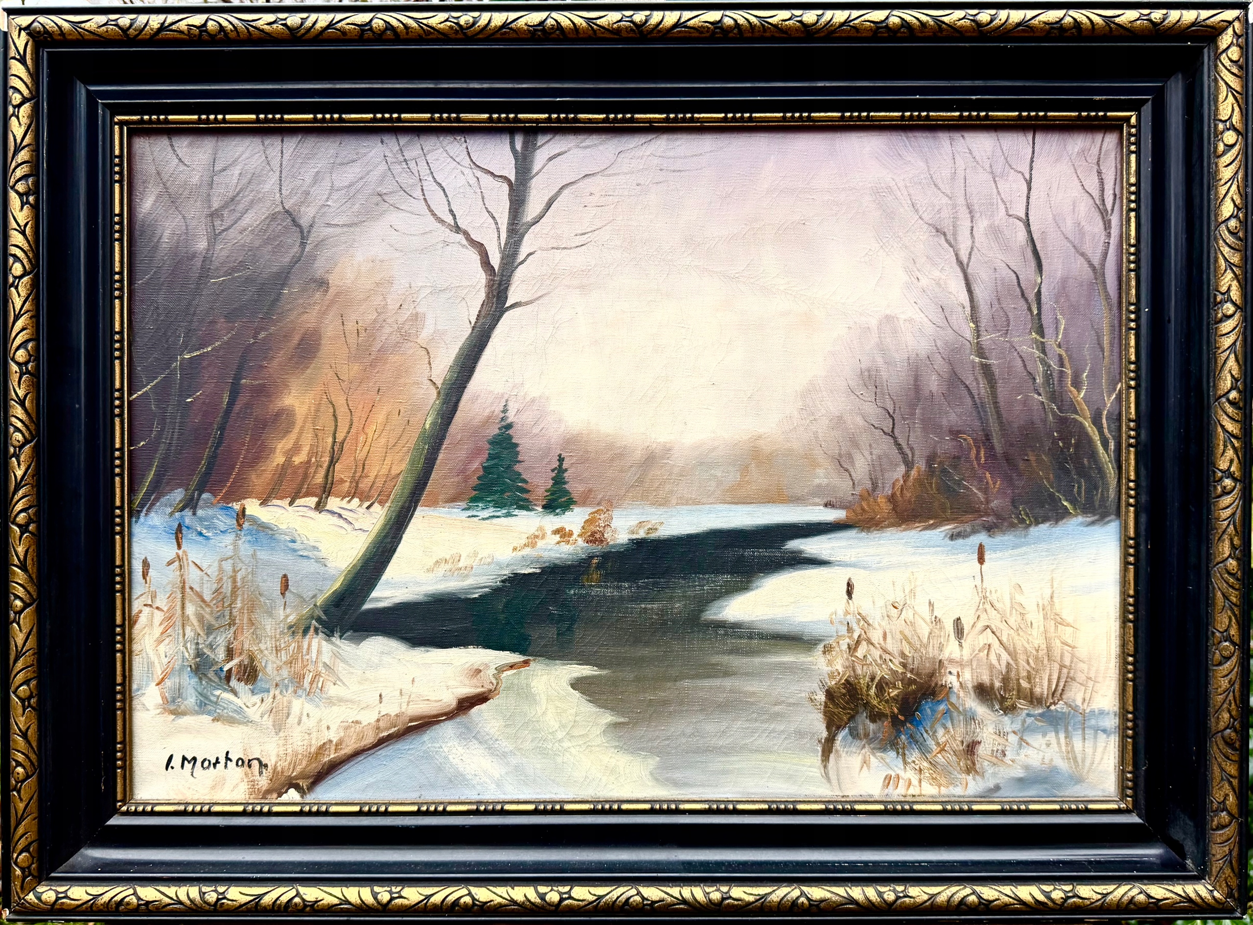 ПІДПИСАНИЙ ОРИГІНАЛ СТАРОЇ КАРТИНИ - ЗИМОВИЙ ЗАХІД СОНЦЯ З РІЧКОЮ СЕРЕД ДЕРЕВ