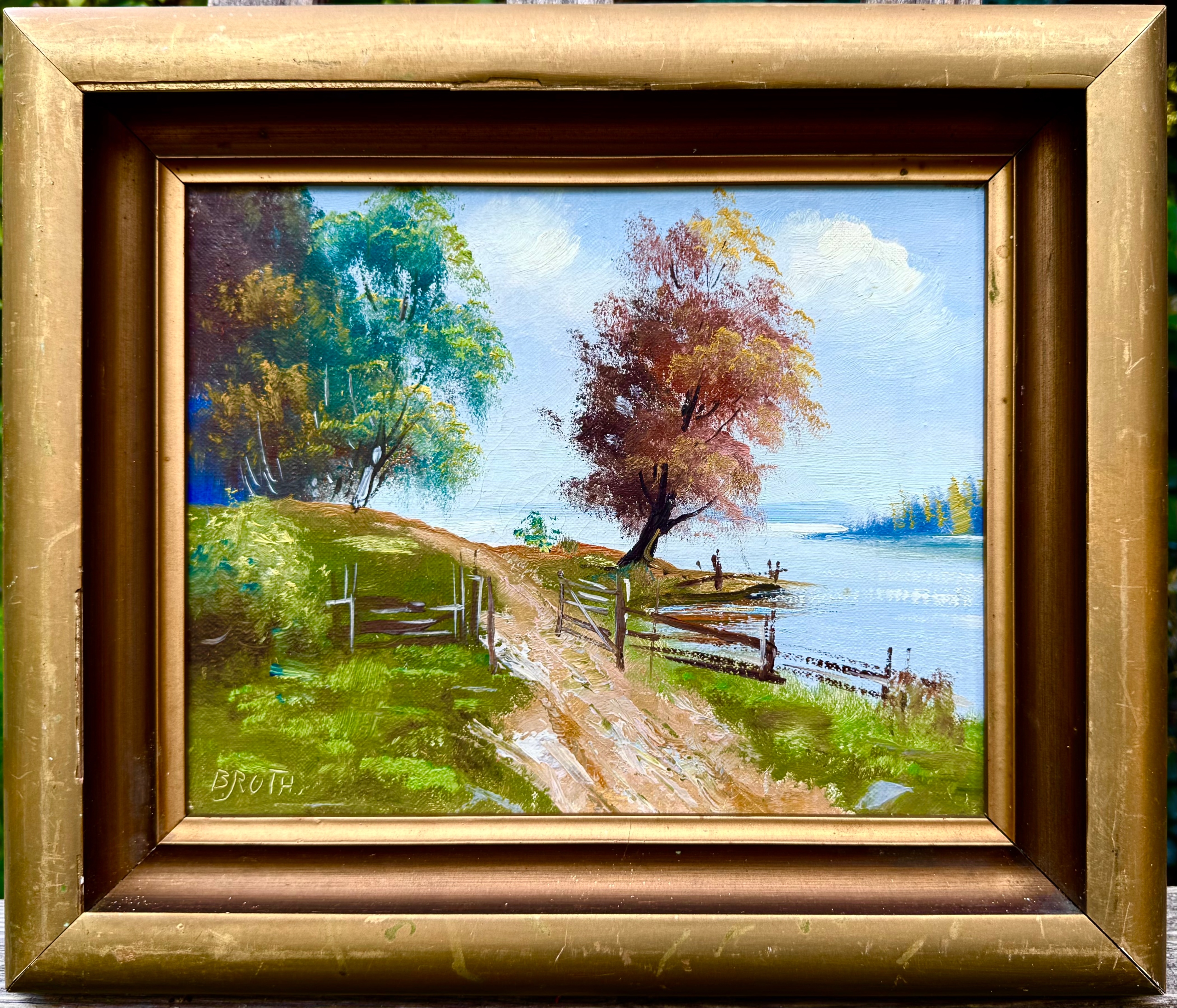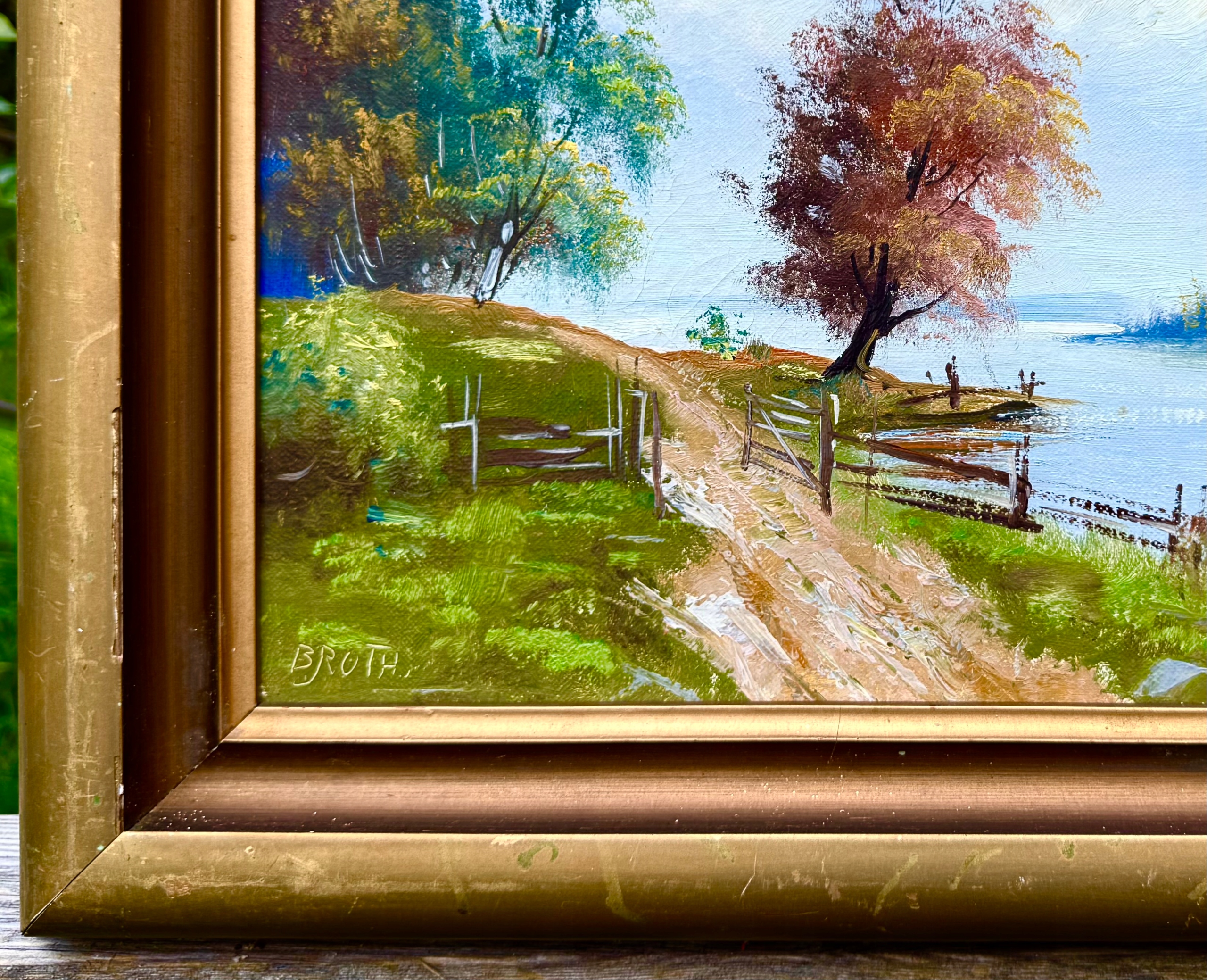ПІДПИСАНИЙ ОРИГІНАЛ СТАРОВОГО КАРТИНИ - ЛІСОВИЙ ПЕЙЗАЖ З ДОРОГОЮ ТА РІЧКОЮ