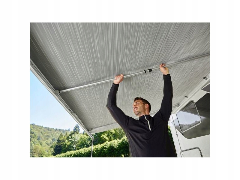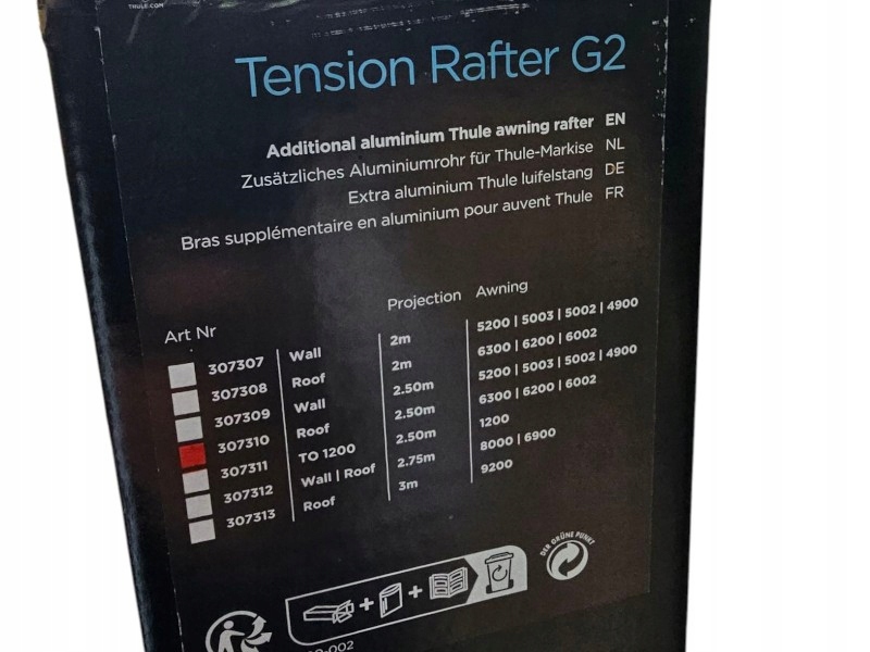 Original rafter strengthening thule G2 2.5m for the awareness of thule models 6300, 6200 and 6002. Крокви виготовлені з алюмінію. Крокви використовуються для зміцнення даху тенту або дозволу встановити бічну стінку або бічну затінення. Крок складається з двох алюмінієвих труб, які з'єднані між собою. Всередині трубки є пружина, завдяки якої під час складання ми стискаємо обидві трубки, а потім розширюємо крокв у відповідних ручках (одна ручка на стіні маркету, а інша на передній частині тенту). Набір крокв включає монтажні елементи та інструкції збору зображень.