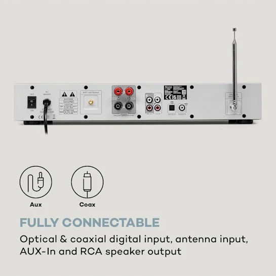 - Роз’єми: 1 x RCA AUX вхід, 1 x RCA стереовихід, 1 x RCA вихід попереднього підсилювача, 1 x оптичний цифровий вхід, 1 x коаксіальний цифровий вхід, 1 x роз’єм антени DAB/FM