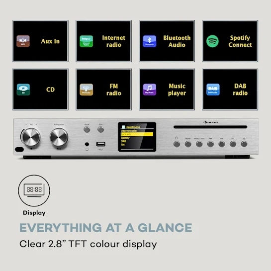 Auna CD HiFi-приймач як Silver Star або Black Star Edition є ідеальним доповненням до існуючих систем HiFi завдяки широкому набору функцій і варіантів підключення. Універсальне радіо з вбудованим Інтернетом/DAB+/FM приймає до 40 000 станцій, має вбудований WiFi, сучасний CD-програвач з розеткою та USB-порт для відтворення MP3. Особливо варто відзначити бездротову функцію Spotify Connect, завдяки якій HiFi-ресивер забезпечує надійну передачу звуку через смартфон, планшет або ноутбук. Вбудований підсилювач класу D з функцією еквалайзера підсилює підключені колонки з вихідною потужністю 2 × 30 Вт RMS і забезпечує різні функції налаштування звуку. Чіткий, кольоровий TFT-дисплей 2,8" з підсвічуванням надає всю інформацію, необхідну для керування та відтворення музики, а також надає достовірну інформацію в будь-який час дня та ночі. У комплект входить повнофункціональний пульт дистанційного керування для зручного керування підсилювачем HiFi.