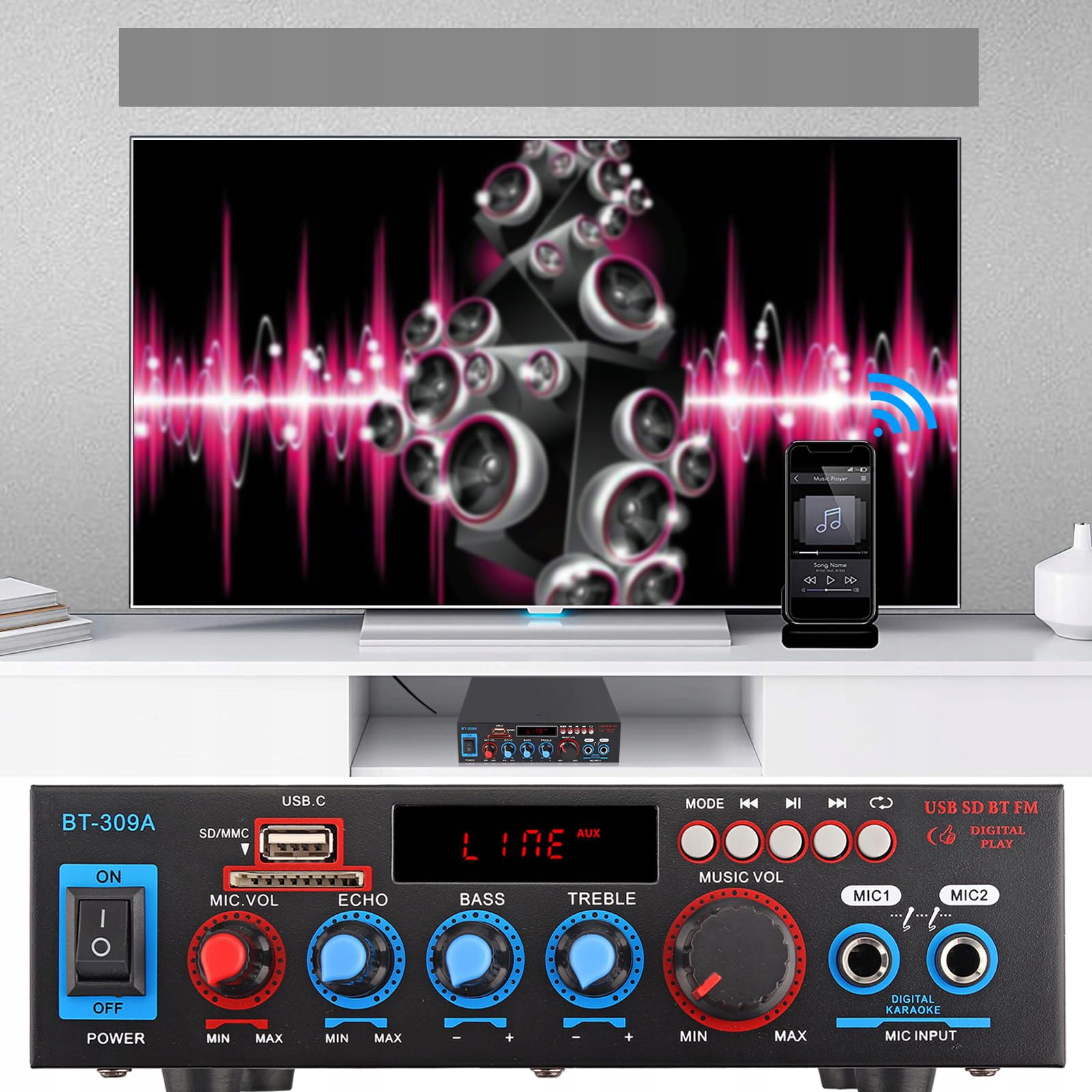 🎵 Два входи для мікрофона, домашня або автомобільна система караоке, дозволяють кільком людям співати одночасно.