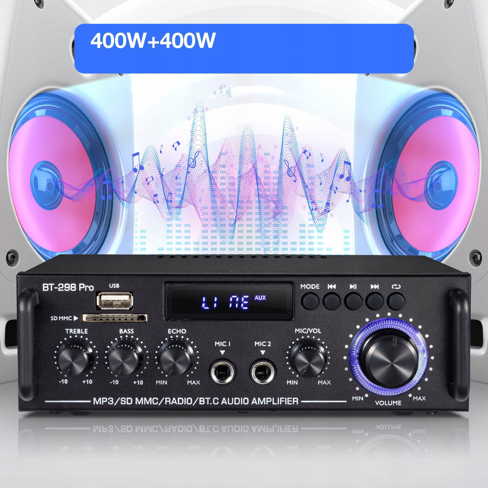 ✅ 【простий у використанні】 : аудіо підсилювач Bluetooth, сумісний з двома пасивними динаміками 4-16 Ом. Підсилювач живлення з віддаленим керуванням для віддалених налаштувань аудіо може прочитати SD -карти та USB -програвачі MP3, підтримує бездротове з'єднання BT, з американською підключенням для легкої роботи, ідеально підходить для використання в системі домашнього кіно.