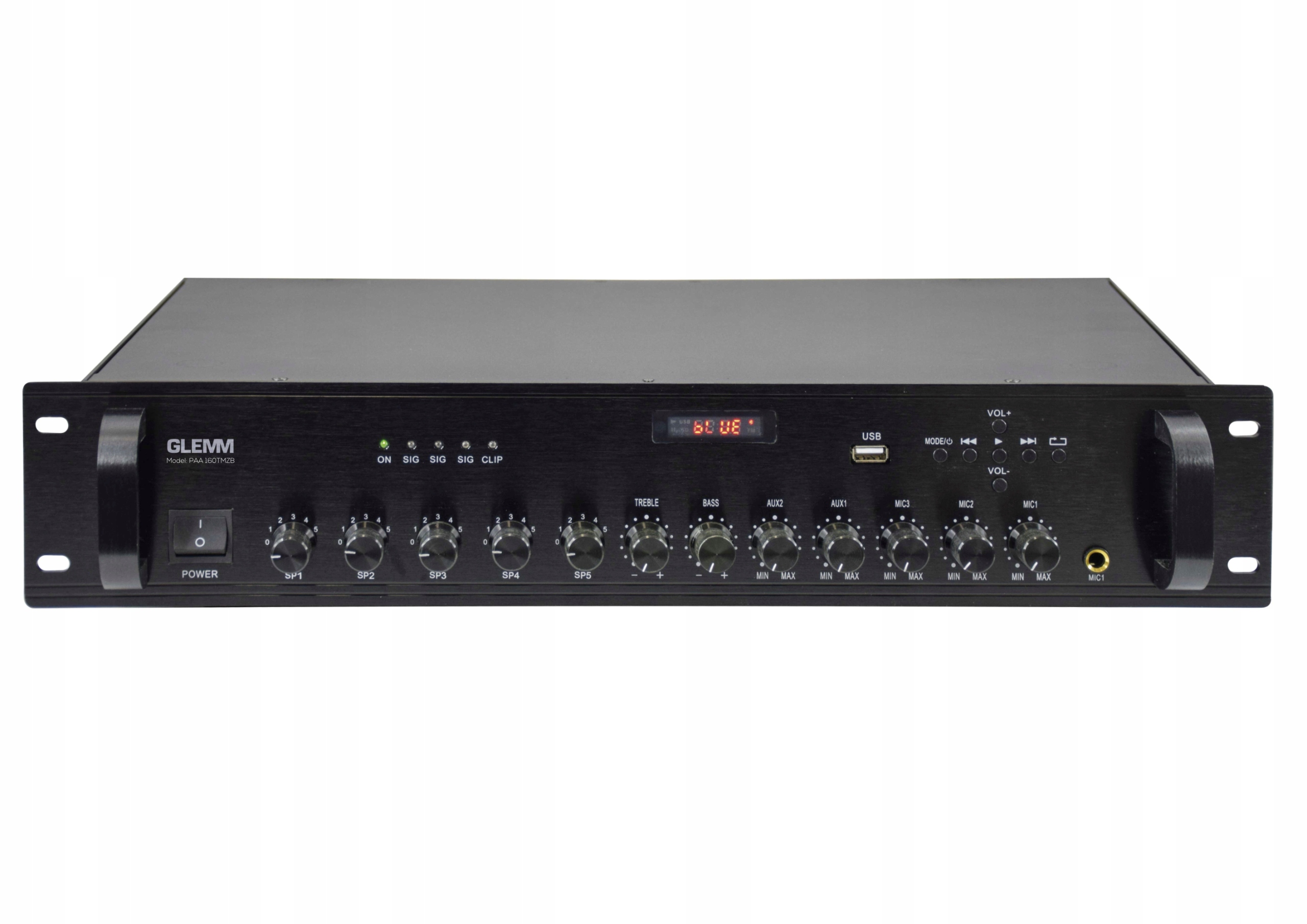 підсилювач PA, що підходить для стандартної збірки в гардеробі 19 'у просторі 2U. Він може забезпечити максимальну потужність 160 Вт, доступну як на виході 4-16 Ом, так і для систем з постійною напругою 70-100 В, розділеною на 5 зон, кожна з незалежним обсягом. 2 входи Aux та 3 мікрофон можуть задовольнити більшість потреб. Модуль MP3 через USB та приймач Bluetooth робить цей підсилювач особливо універсальним. Вхід MIC 1 призначений лише для ємнісних мікрофонів із зовнішнім джерелом живлення (акумулятор або джерело живлення). Не сумісний із звичайними динамічними мікрофонами.