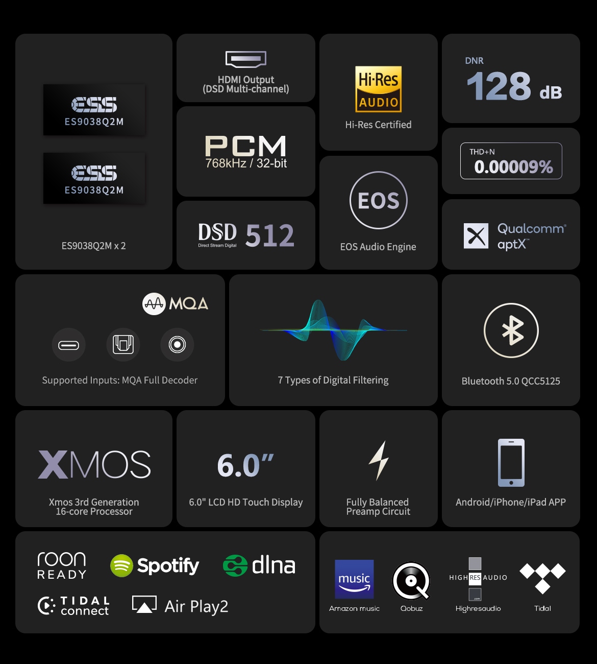- Підтримка повністю DSD512, PCM768KHz @ 32-розрядне та декодування MQA.